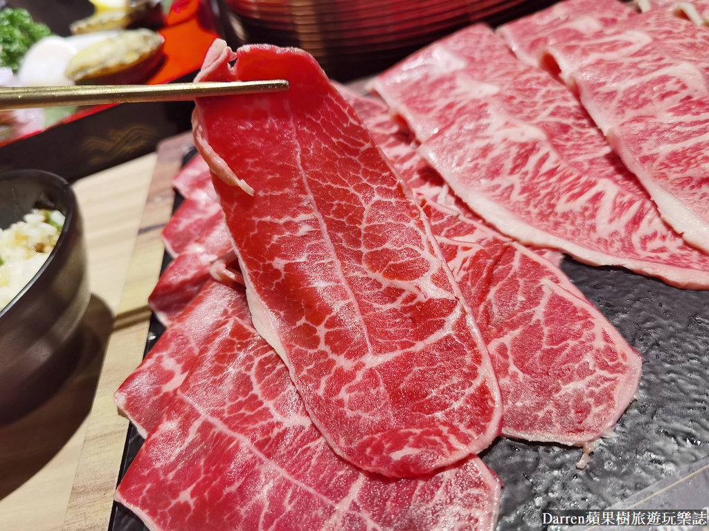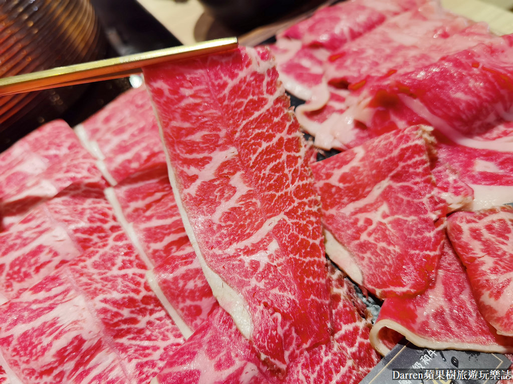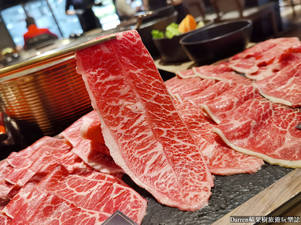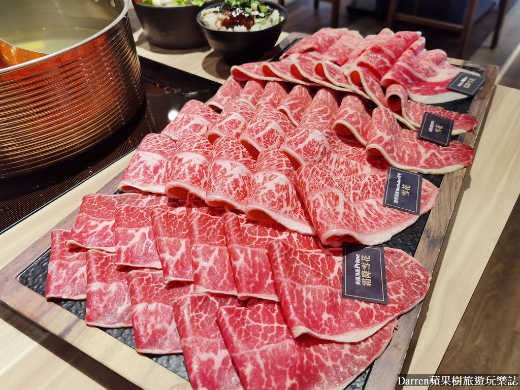 頂級各國雪花牛肉鍋端上桌,在肉盤上面都會有名稱標示,稍微看一下油花以及肌理紋路也有所不同,而且牛肉都很大片也有一定的厚度