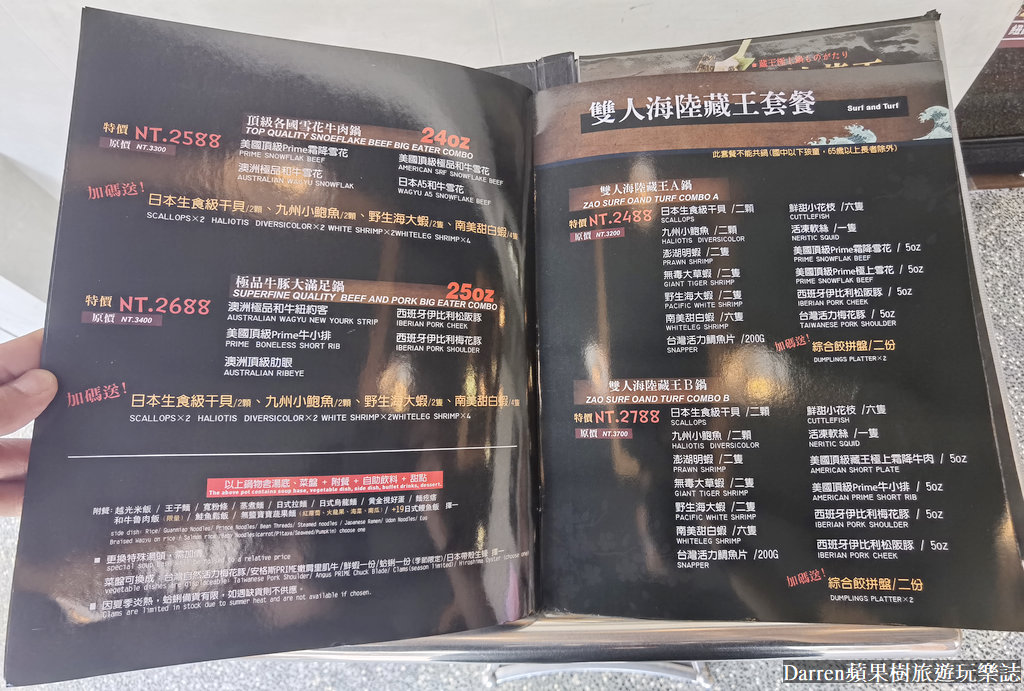 藏王極上鍋物菜單頁數有點多,大家有興趣可以點菜單連結,最便宜的火鍋單價只要399元起,來到肉品最強火鍋店,樹小編直衝頂級各國雪花牛肉鍋,另外還有加碼送日本生食級干貝、九州小鮑魚、野生海大蝦、南美甜白蝦