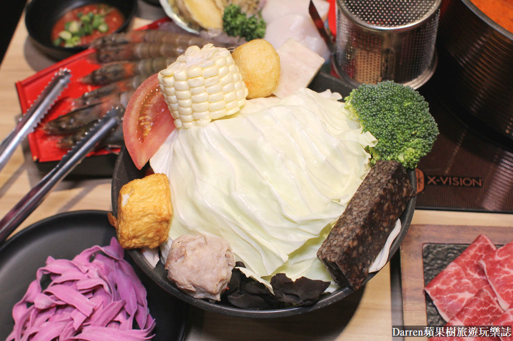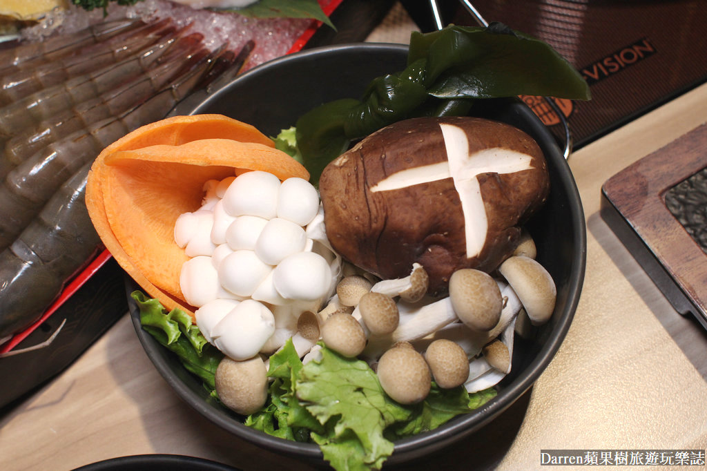 吃完肉品進攻海鮮,我把海鮮都放原味蔬菜湯底,光看到加碼送日本生食級干貝、九州小鮑魚、野生海大蝦、南美甜白蝦等等,整個海陸通通都有,整個非常有爽度