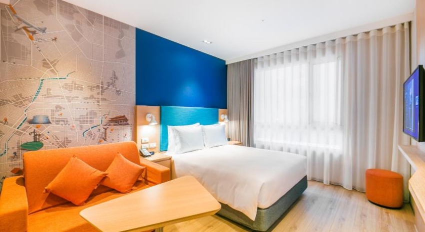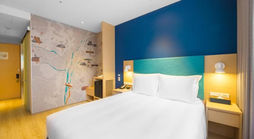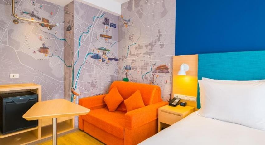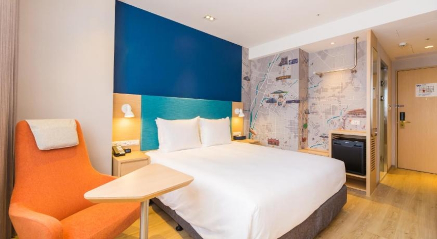 臺中逢甲智選假日飯店全館共有96間客房,內裝色彩豐富、時尚簡約,還把台中地圖當成裝飾蠻有特色。