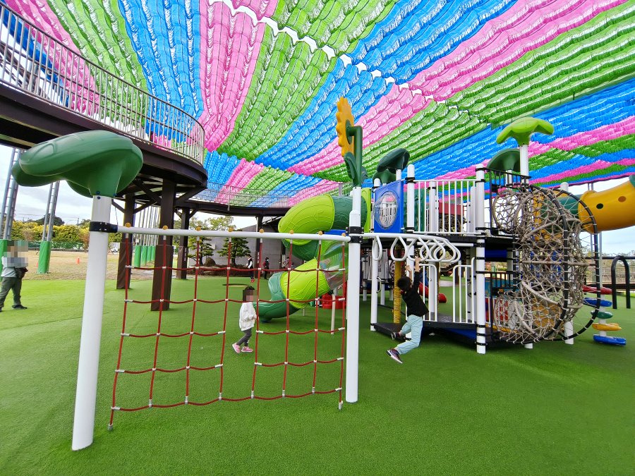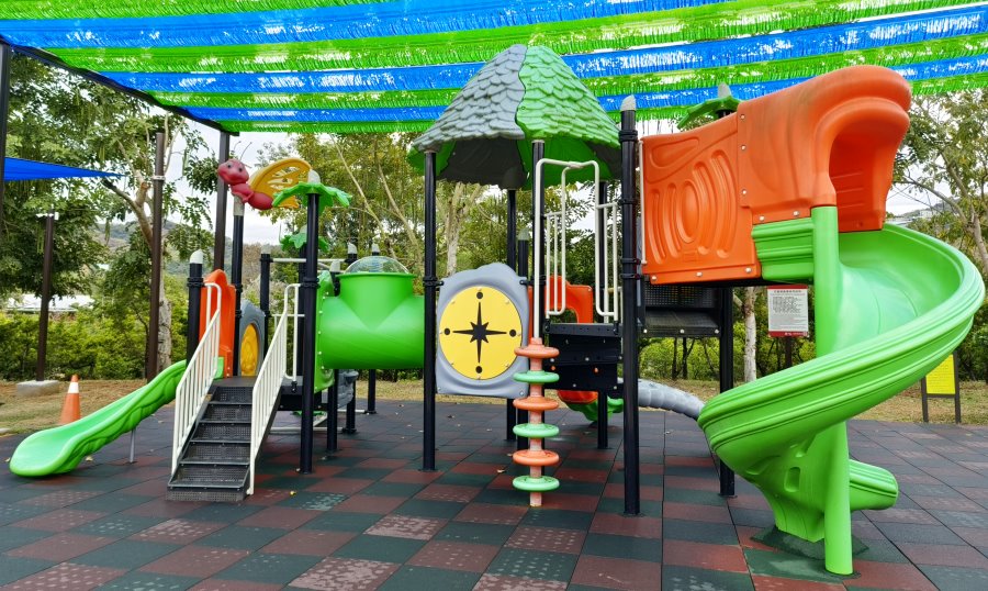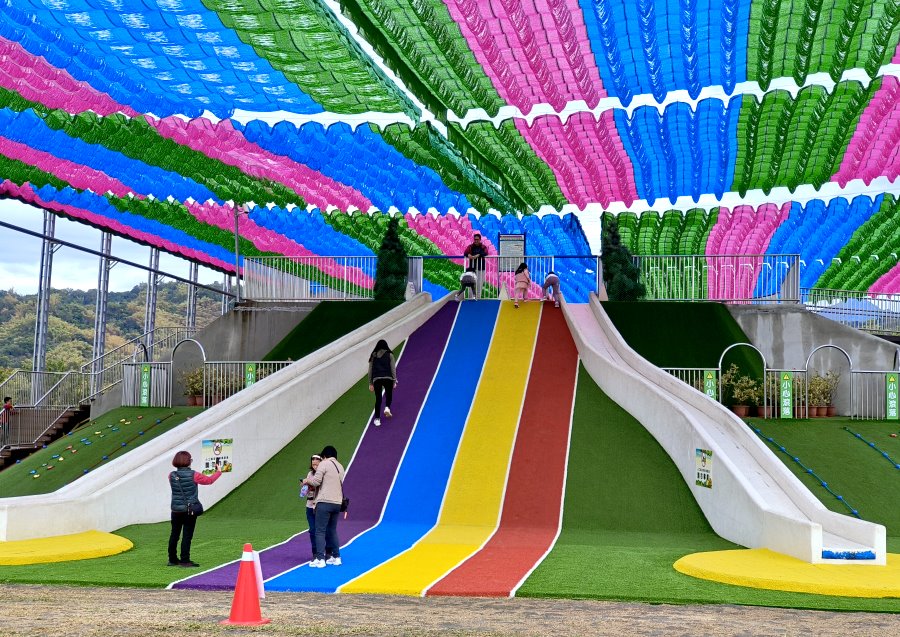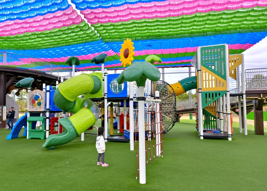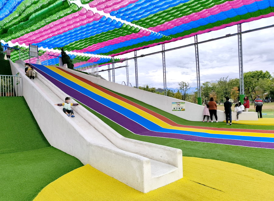 南投景點「名間親子生態園區」佔地2.6公頃,是南投第一座結合景觀、生態、親子遊憩功能的大型生態園區,距離名間交流道也只要5分鐘車程,很適合當作中途休息站,我們當天帶三口組前往葉子秘境露營前就是先來這裡放電;除了有吸睛的巨無霸彩虹溜滑梯之外,還有環形無障礙步道串聯多項兒童遊樂設施、體健設施、沙坑、噴水池、生態池等,讓小朋友可以好好玩耍,大人也可以拍網美照、休憩一下!我們覺得這裡最棒的是停車很方便,很多遊樂設施都有遮陽設備,就算夏天來玩也不會太熱,加上耐用的人工草皮,讓小朋友可以安心跑跳~~之後園區內還會增設廁所,就不用大老遠跑到馬路對面的農場運銷公司上廁所,園區功能也會更加完善方便!