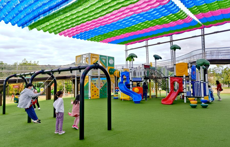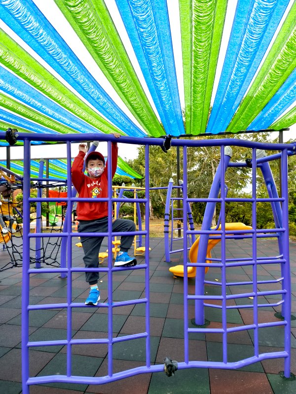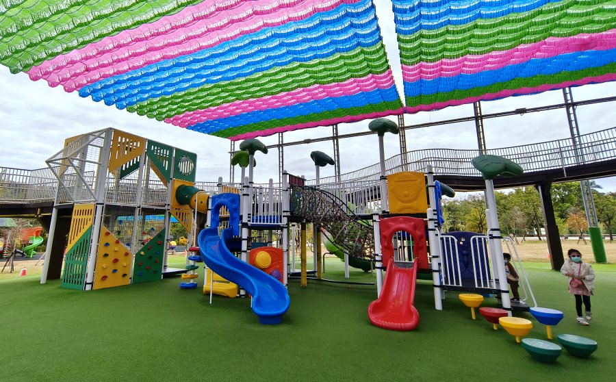▼後方還有一整片的遊樂設施,包括溜滑梯、盪鞦韆、攀爬設備等,上頭也有遮陽設備!最特別的是一旁還有環形無障礙步道,對小朋友來說就好像是天空步道一樣~~跑在上頭也很促咪!