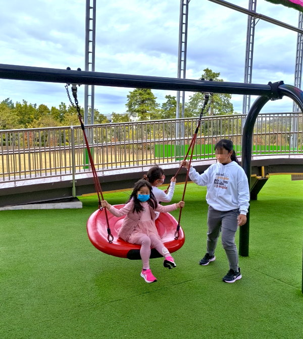 ▼包覆式的盪鞦韆也很受小倆口喜愛~~是說小口弟這時已經在天空步道上頭奔跑啦!