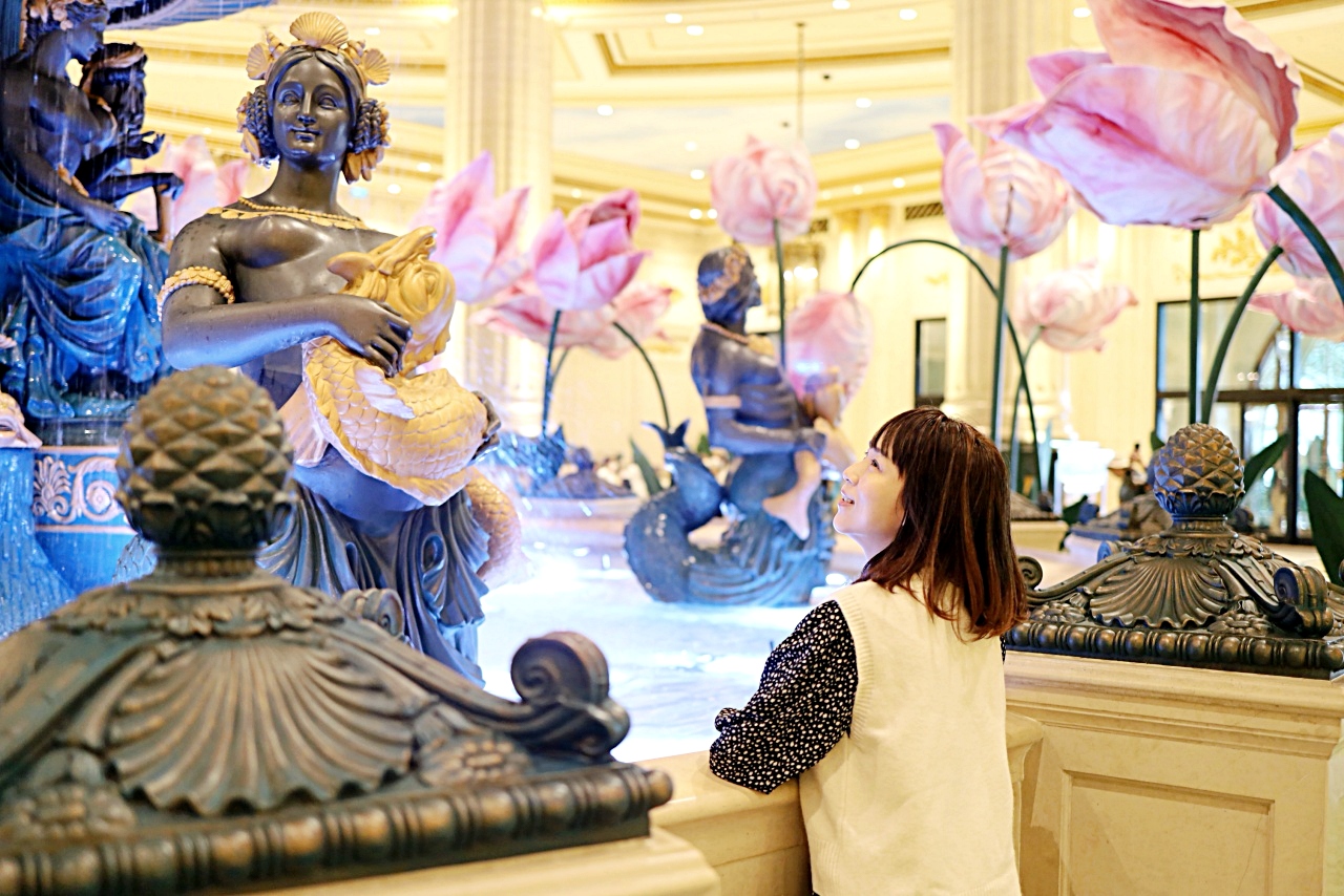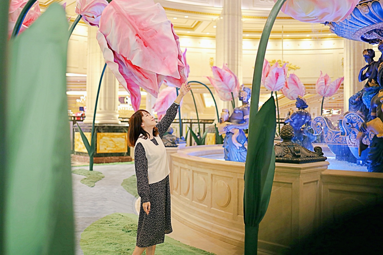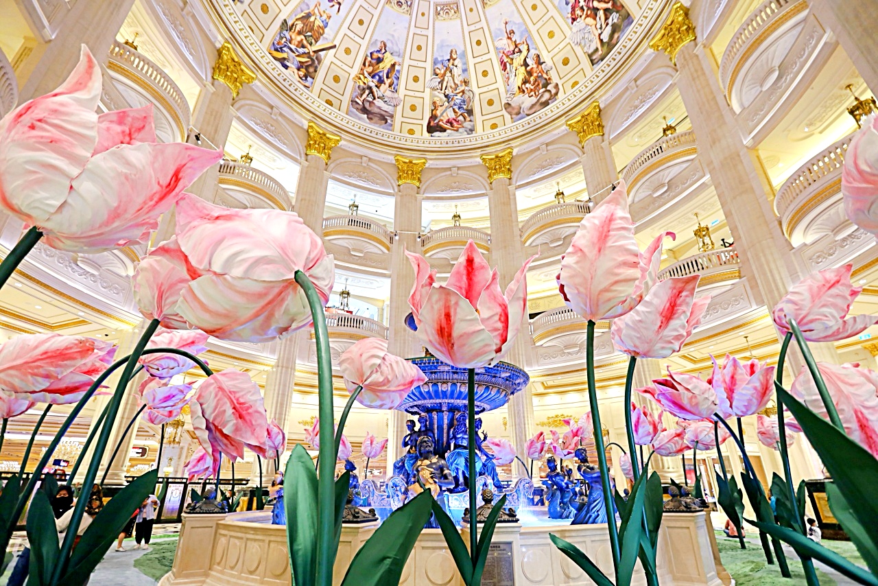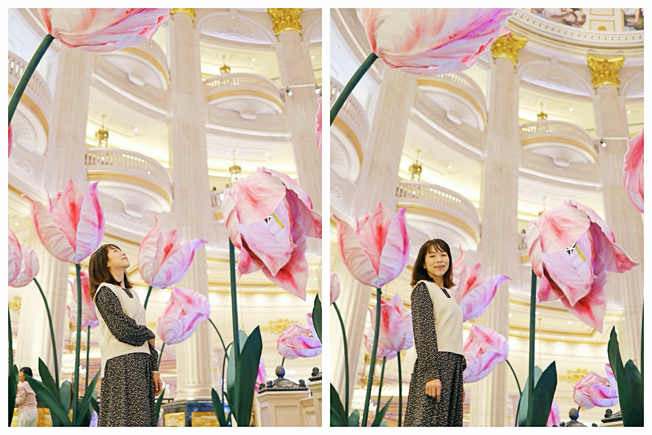 剛踏進圓形大廳,我就被眼前粉色系的巨大鬱金香給驚艷到!在圓形彩繪歐式屋頂和白色金色穿插的法式建築裡,更顯得特別夢幻,很不可思議!這裡是澳門!每一朵巨型鬱金香都是藝術家手工上色,粉嫩色展現出春天氣息,展覽時間即日至5月31日。