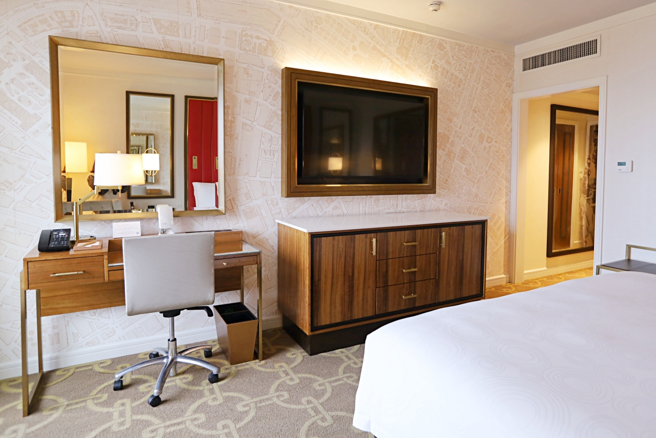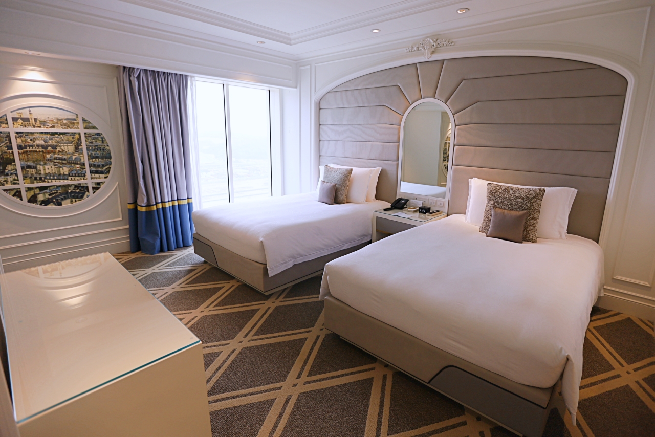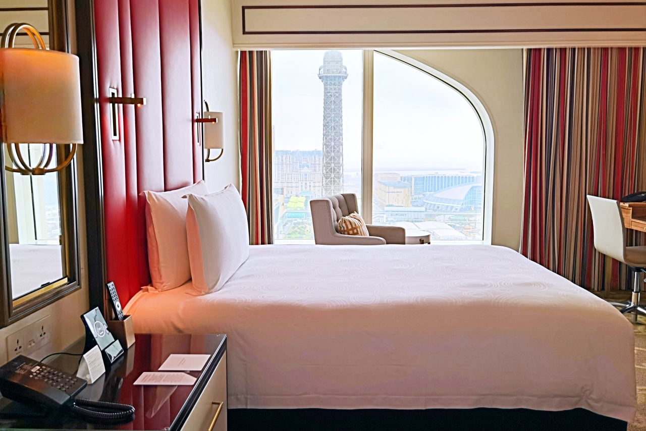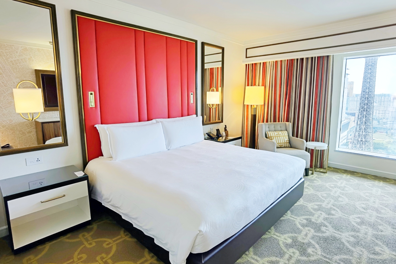 巴黎人酒店的房型共分為四種:豪華客房、艾菲爾客房、天倫大床客房、香檳套房。如果對巴黎鐵塔情有獨鍾的話,就選擇「艾菲爾客房」在房間就能欣賞窗外的鐵塔風光。房間有33平方米大空間,有兩小床或一大床的選擇。以優雅的法式風格貫穿,鮮豔的紅色床頭板更是畫龍點睛,讓空間變得活潑許多。