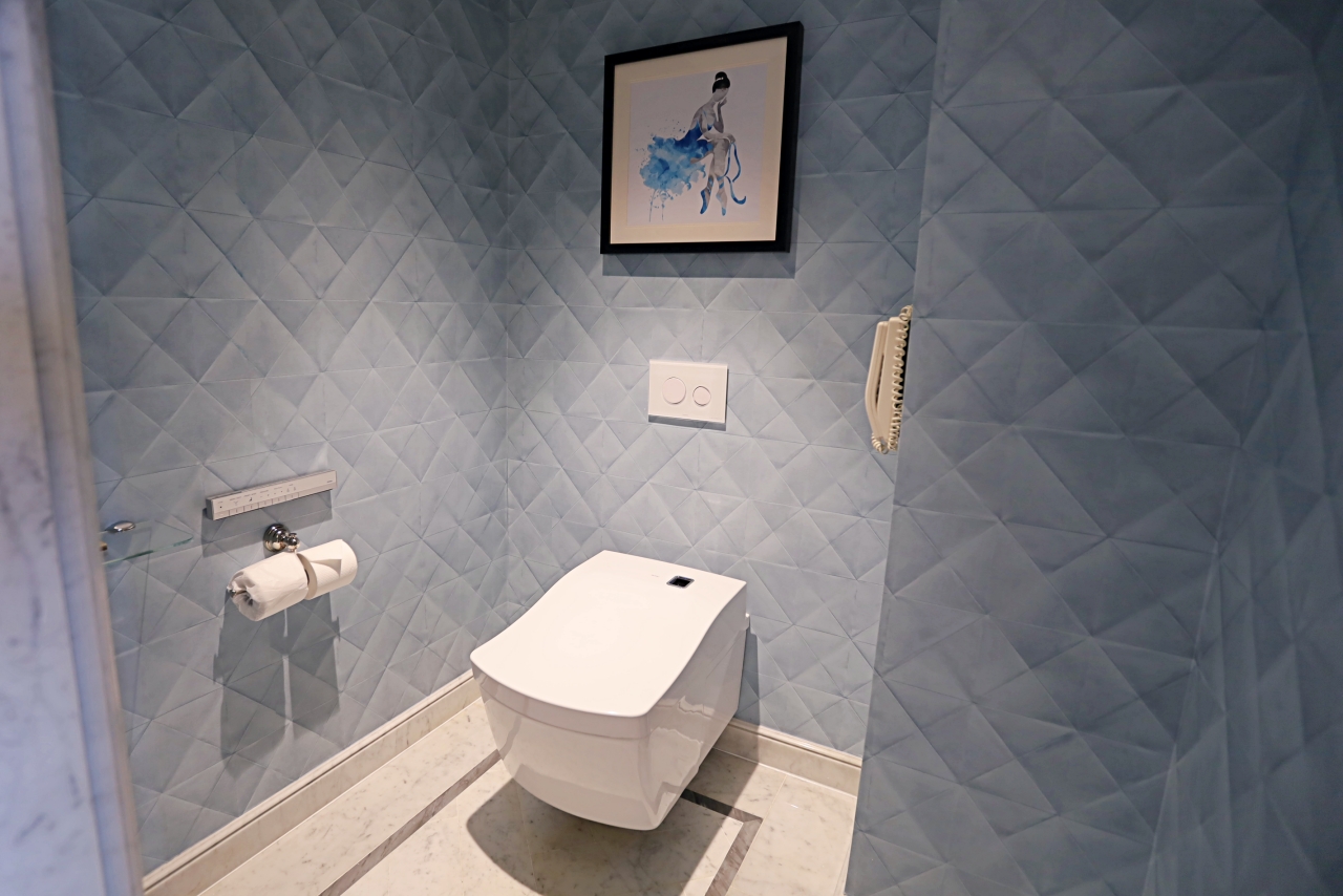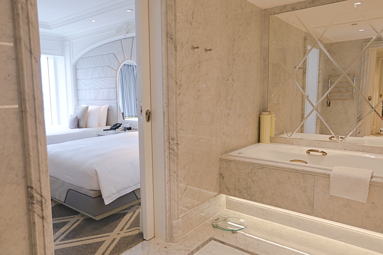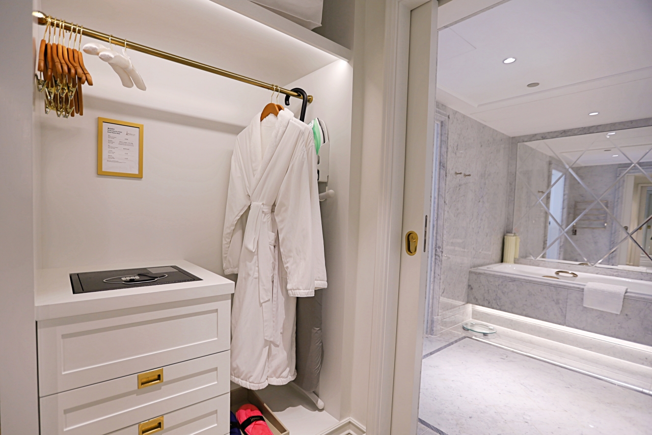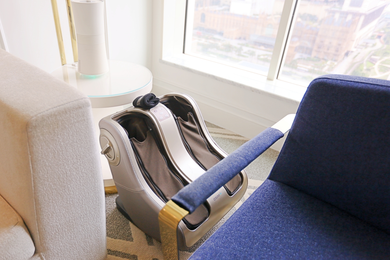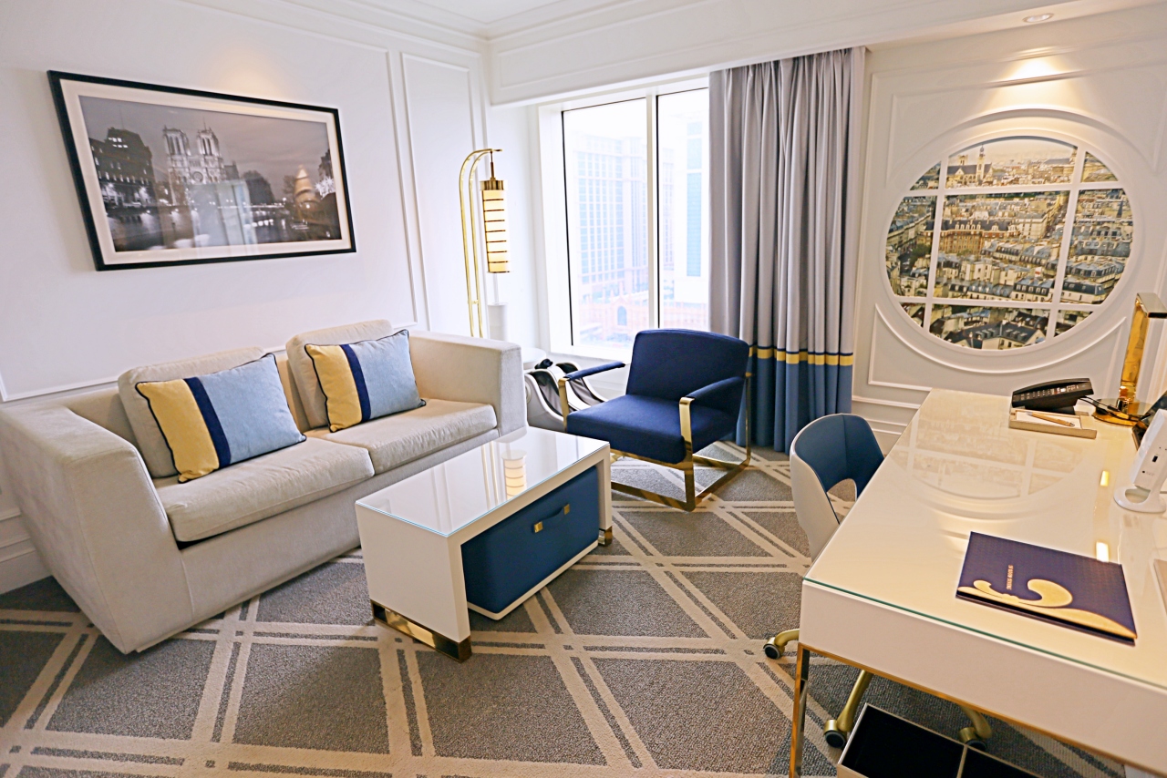 如果是親子旅行,入住香檳套房也是很不錯的選擇,有跟房間一樣大的獨立客廳,用藍色與白色打造出時尚的法式風情。空間有72平方米大,對於家庭客非常適合。房間內貼心的提供腿部按摩機,在澳門我們都是用走路的,每天光是步行就超過2萬步,完全不輸給在日本旅遊,這個按摩機當然很需要。