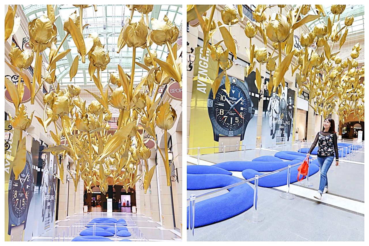 還有一個秘密景點,位在巴黎人購物中心三樓,有個廊道上漂浮著金色鬱金香 ,絢麗的鬱金香像是穿越時空般營造出超現代的風景,別錯過這個長達20米的金色鬱金香花園囉。