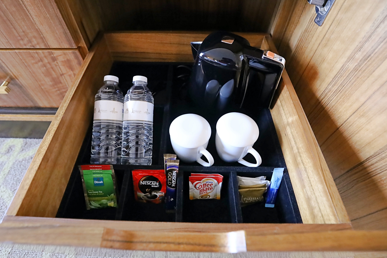 ▲基本的茶包、咖啡、礦泉水也有提供喔,可惜冰箱內空無一物,想要喝飲料的話就只能買回來冰了。