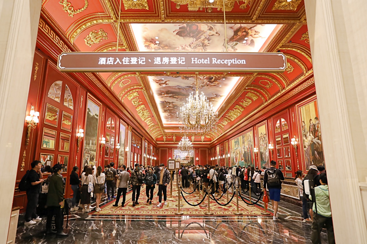 飯店接待大廳的壯麗讓人驚艷連連,以紅色底、金色線條配上華麗水晶吊燈,這可是以凡爾賽宮的鏡廳為範本,仿造17-18世紀的細緻雕花法式地毯,牆面上配色繽紛的壁畫,用以描述拿破崙生平事蹟。這不只是接待大廳,更是一個浮誇藝廊了吧!人多的時候就可以一邊等待,一邊好好欣賞歐洲宮廷的壁畫。