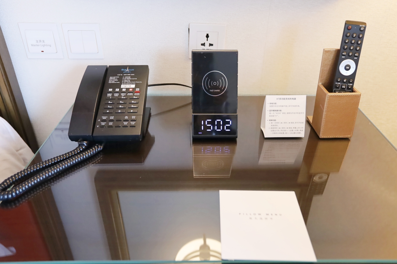 ▲床頭櫃上有著無限充電盤,手機直接放上去就可以充電了,還可以連結藍牙播放音樂。