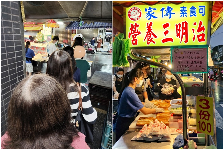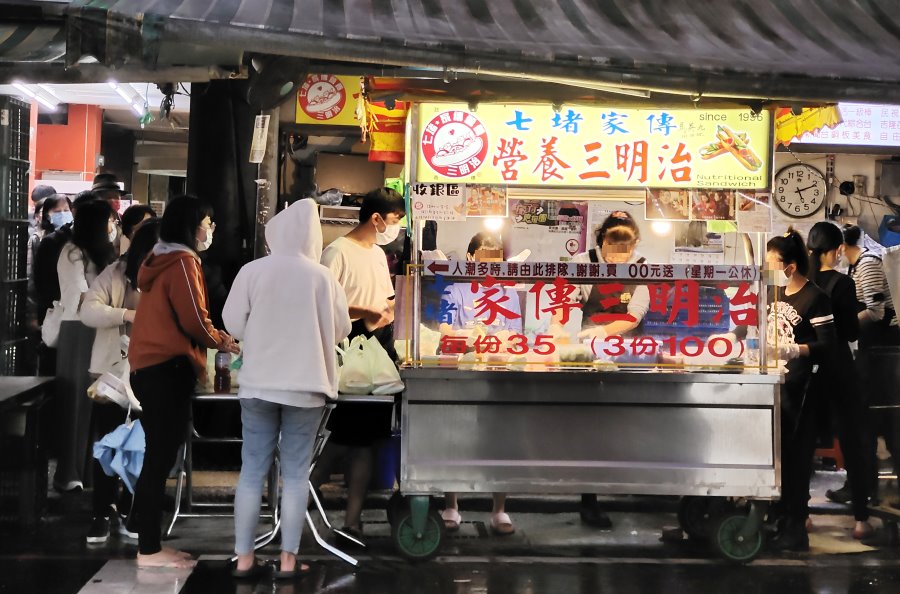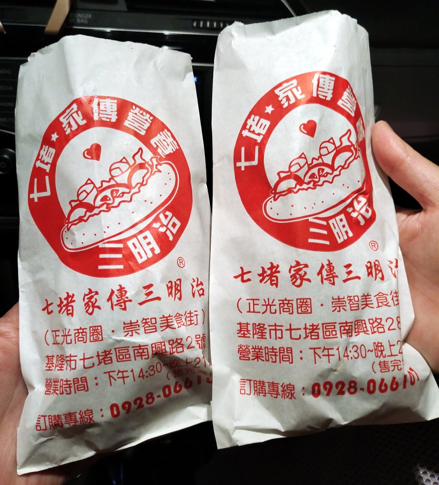 ▼玩累了肚子也餓了,我們開車到七堵夜市來覓食,大家可以像我們一樣停在歐特儀-光明二路公有停車場再走過來也很近;第一家就是我們最愛的七堵家傳三明治,當天人潮爆棚,竟然還排了好幾間店面不誇張,但還好前進速度也挺快的,大概排了20分鐘左右就買到了!
