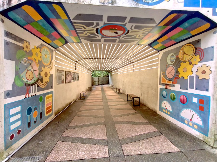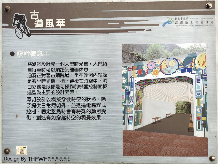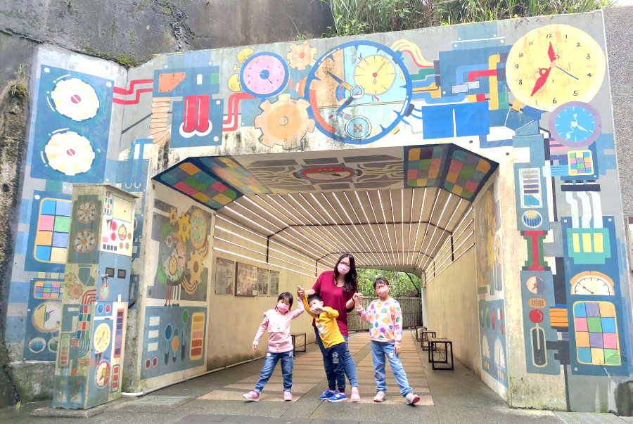 ▼騎了半個小時左右,我們終於抵達五堵鐵路隧道啦~隧道口的涵洞特別設計成大型時光機的模樣,繽紛的塗鴉加上光影投射,很有穿越時空的感覺!裡頭規劃為車友休憩區,大家騎累了可以來這裡休息拍拍照也不錯!