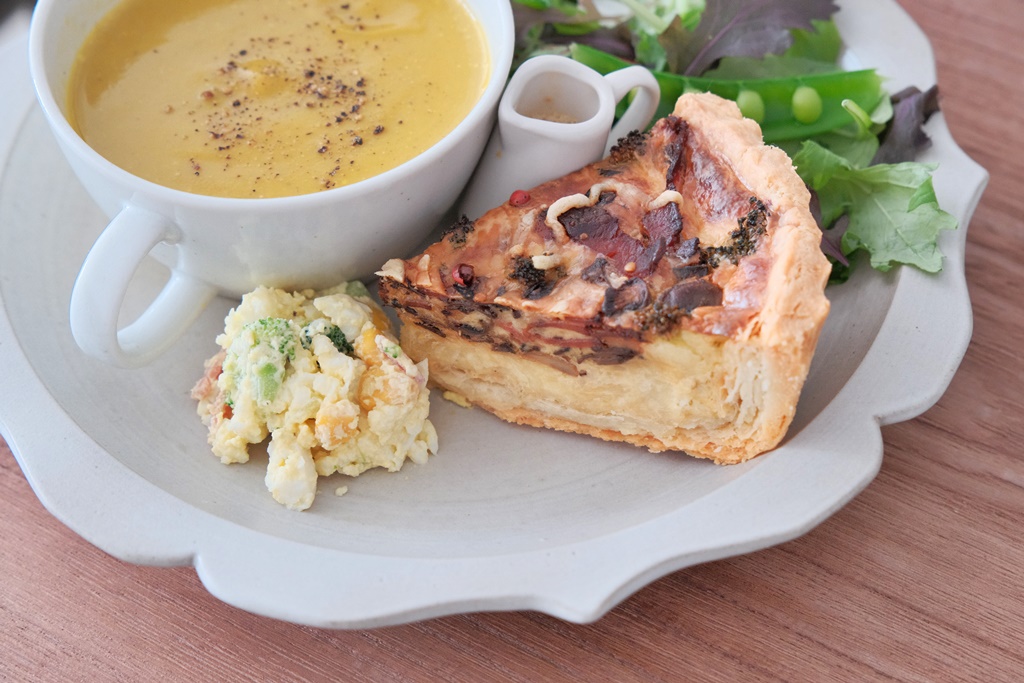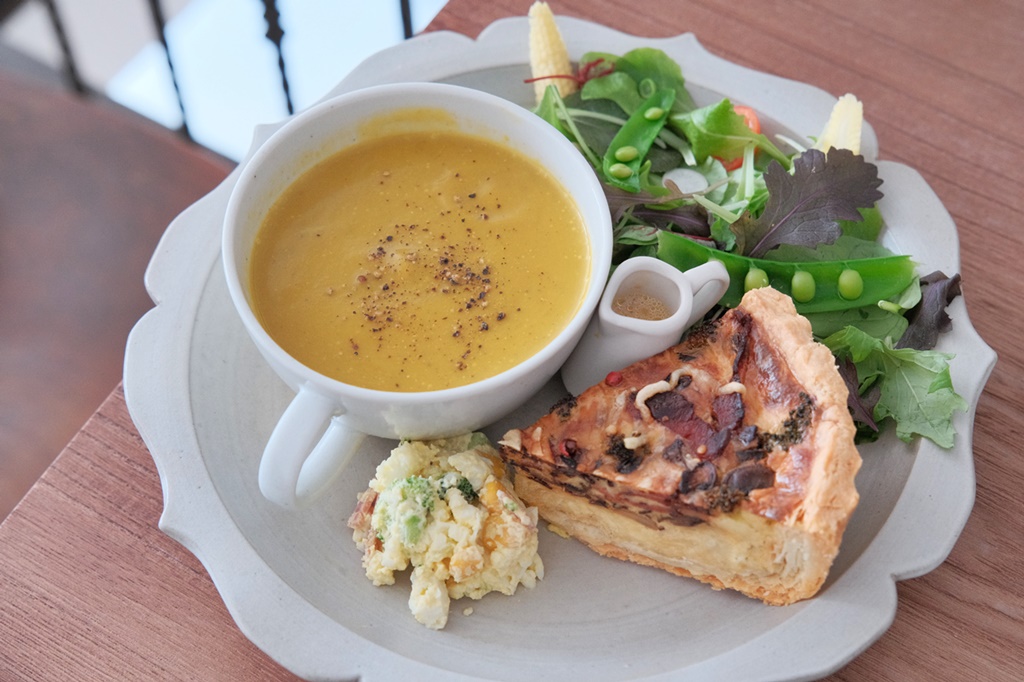 包含湯品、沙拉和一杯日式麥茶(亦可-30元折換其他飲品),主角鹹派表現出色,口感飽滿、香氣十足,外皮香酥不會過乾,湯品是非常濃郁的南瓜濃湯,濃到可以當寶寶副食品了哈哈,搭配新鮮沙拉和配菜,整體份量很夠唷!