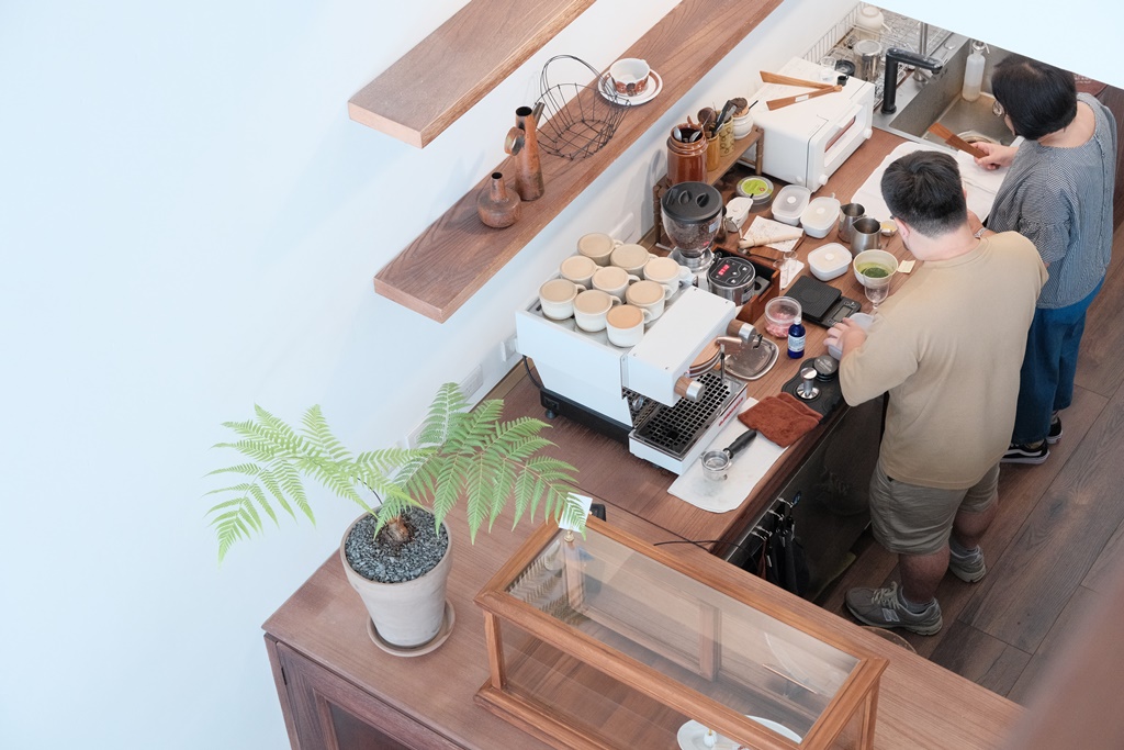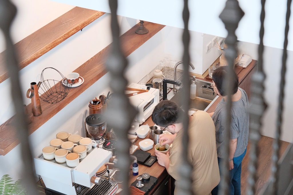二訪坐在樓上,位置剛好能看到樓下吧檯,意外發現抹茶是現刷的!記得喝之前要攪拌均勻,味道不錯唷~
