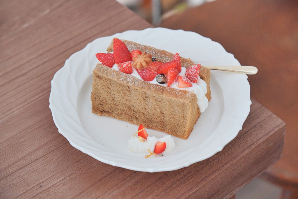 米做的戚風蛋糕體好柔軟,內餡的鮮奶油也超綿滑,不甜不膩好好吃,可惜草莓偏酸,我當天有建議闆娘可以換其他水果,是時候該跟草莓 say goodbye 啦,哈哈!