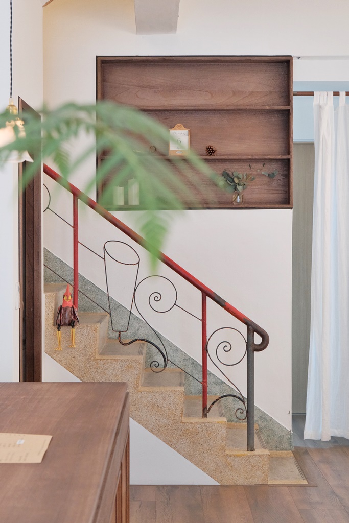 像是鄉下阿嬤家的樓梯、帶點斑駁感的樓梯拉花扶手