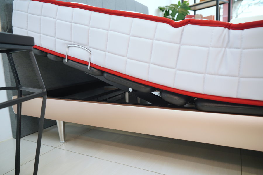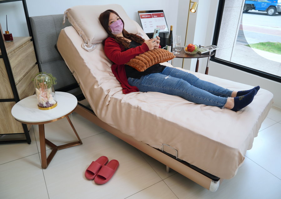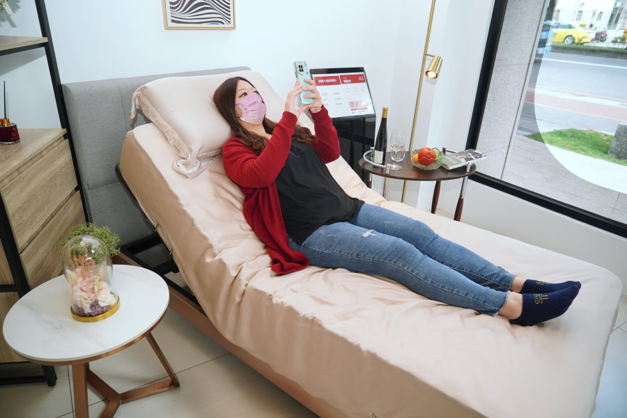 ▼一躺上去沒多久,口咩立刻用無線遙控器把床墊立起來,說這樣滑手機、追劇剛剛好,能躺在床上不被打擾的滑手機真的是媽媽睡前的小確幸無誤(笑);因為他們家的是無段式微調電動床,想要什麼角度都可以自行調整,不管是肩頸、脊椎、腰臀或是腿部都能得到舒緩與放鬆!只能說現在的電動床不再是長輩與病人的專利,也不是只擔任輔具的角色,只要是想追求舒適睡眠、自在躺感的朋友都很適合!