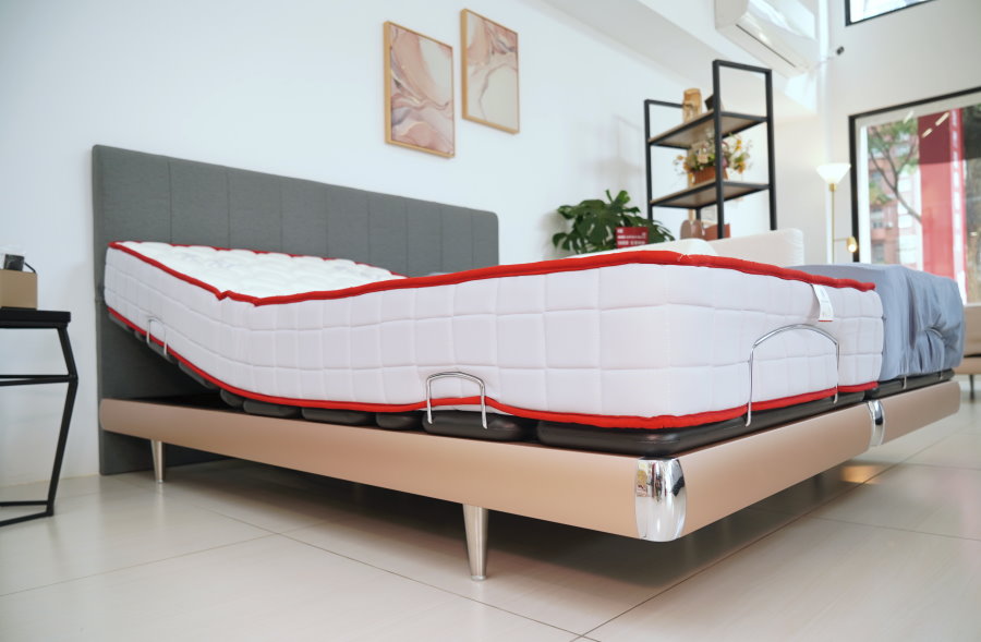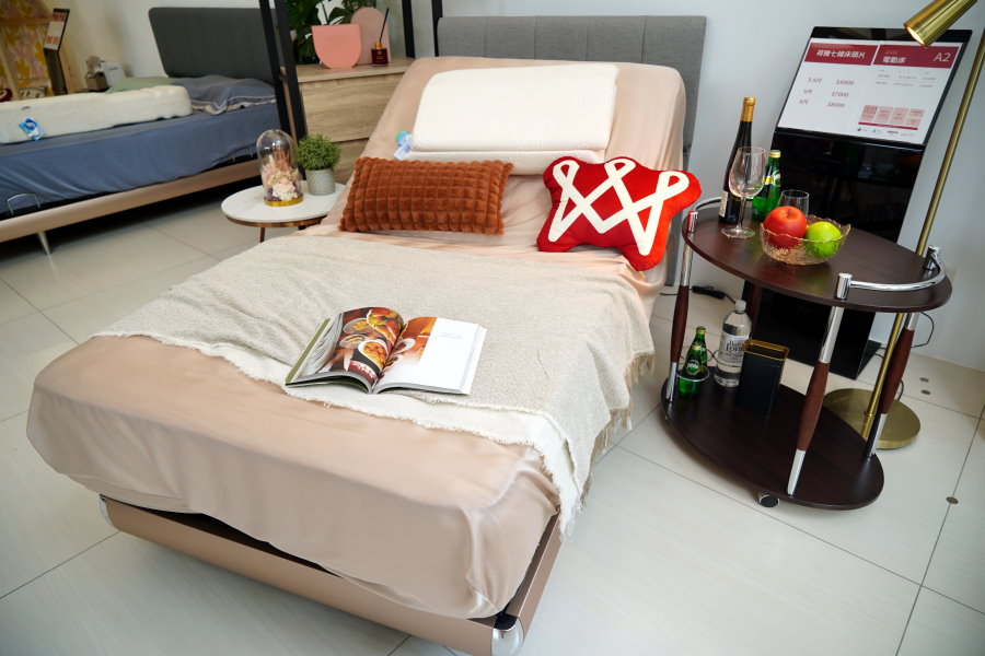 ▼他們家電動床有四種不同軟硬度選擇,建議大家一定要親自來店內試躺體驗,才能找到最適合自己的電動床!像這張頂級電動床D1採用的是傳統彈簧搭配2 cm的涼爽墊材,適合喜歡支撐力強又怕熱的朋友,這張電動床對我們來說躺感就比較偏硬,但又不會硬過頭,還是帶點Q感,不過我們還是比較喜歡剛剛那一張(笑)!
