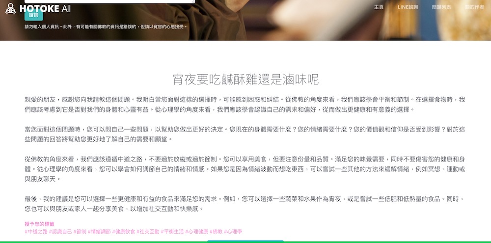 「Hotoke AI」操作上非常簡單,不需要輸入任何個人基本資料,只要在欄位中輸入你的疑惑,舉凡像是人生的意義、明天要上班怎麼辦,甚至是宵夜想要吃鹹酥雞還是吃滷味,「Hotoke AI」都能夠一本正經的回答你。