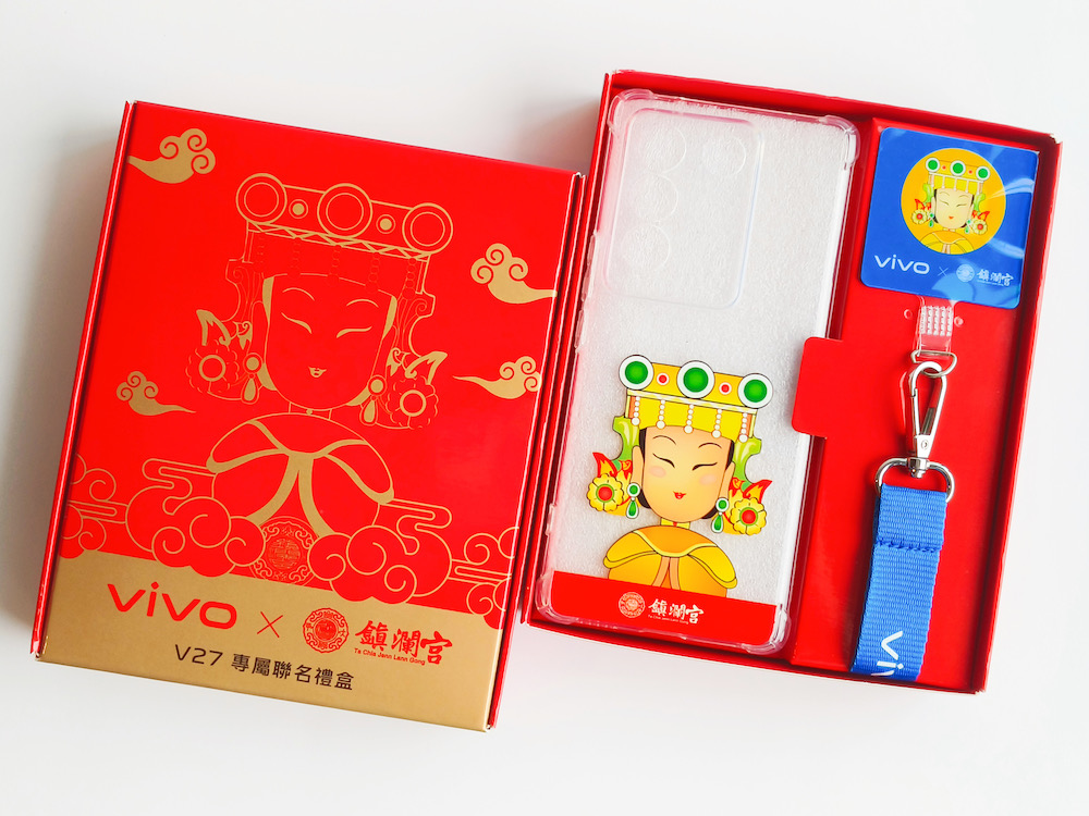 vivo 看好全民瘋媽祖熱潮,首度攜手大甲鎮瀾宮推出國民女神「媽祖」限量聯名禮盒周邊,自 4 月 17 日起至指定通路購買 V27,即贈過香爐祈福加持過的 vivo X 大甲媽祖 V27 專屬聯名禮盒,內含新機必備的手機保護殼及手機掛繩組,印有超 Q 版媽祖畫像,讓 V 粉隨時享有大甲媽祖庇佑保平安!