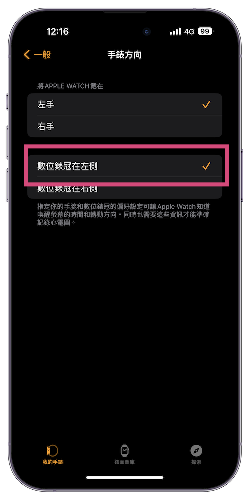 步驟 1、打開手機上 Watch app 後依序進入「設定」>>>「一般」>>> 「手錶方向」,在裡面把「數位錶冠右側」改為「數位錶冠在左側」。