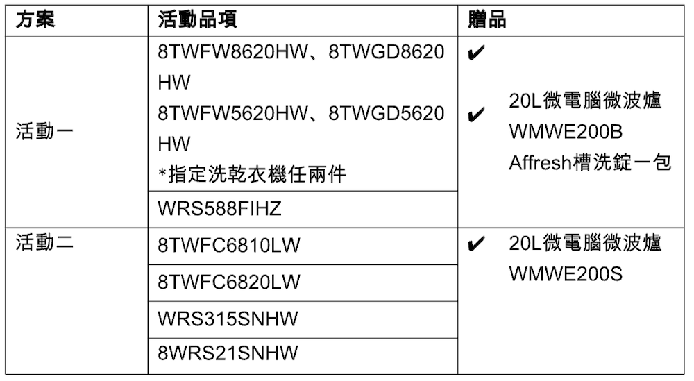 「惠而浦 歡樂美一夏」共有兩個活動,只要消費者到通路購買「W Collection系列滾筒洗衣機、W Collection系列滾筒乾衣機」指定洗乾衣機任兩件或「W Collection 840公升對開門冰箱」便能獲得惠而浦 20L 微電腦微波爐WMWE200B(市價NT3,400)及 Affresh槽洗錠一包(市價NT490)。