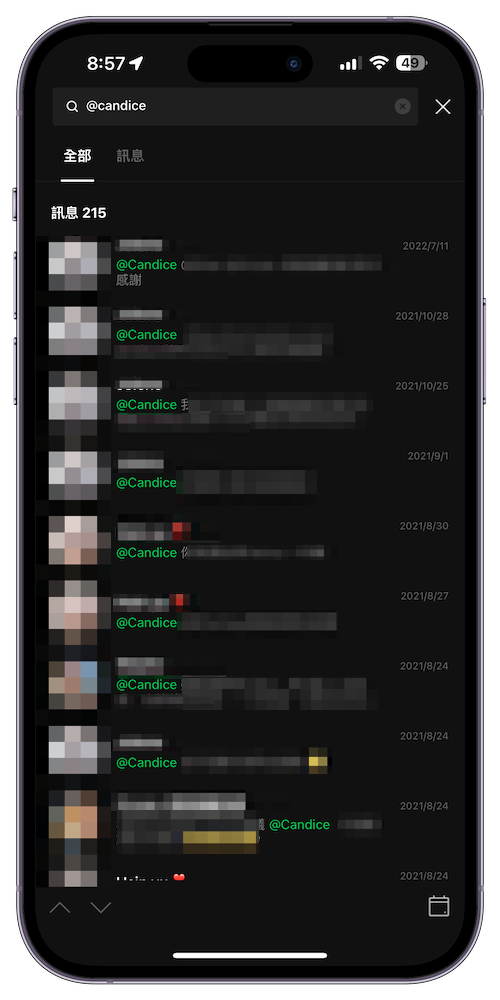 如果自己已經鎖定想要找尋被 tag 的群組,那麼就在進入群組後透過上方的「搜尋」圖案,輸入 @自己名稱或 @all,接著就會出現所有自己被 tag 過的訊息。