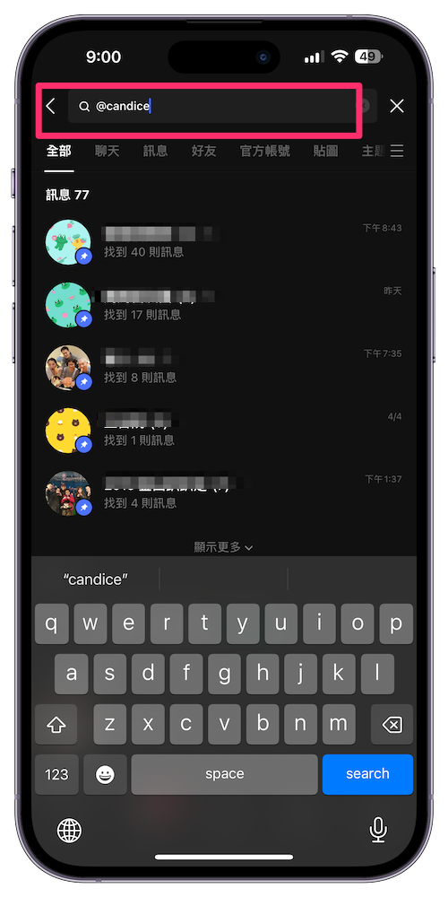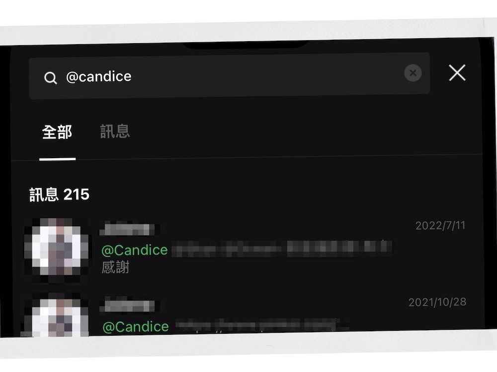 如果不確定自己要尋找的群組,我們也能在 LINE 聊天首頁,透過上方的「搜尋」欄位中輸入 @自己名稱 或 @all,接著會列出所有標註過自己的聊天群組。