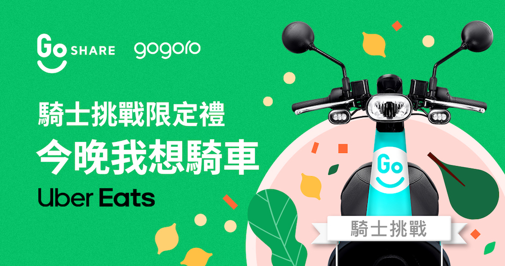- 4/17 至 4/30,GoShare 用戶只要完成「今晚我想騎車」騎士挑戰(含 5 趟有效騎乘),即可獲得 GoShare $100 元騎乘金獎勵、Uber Eats $200 元優惠序號。