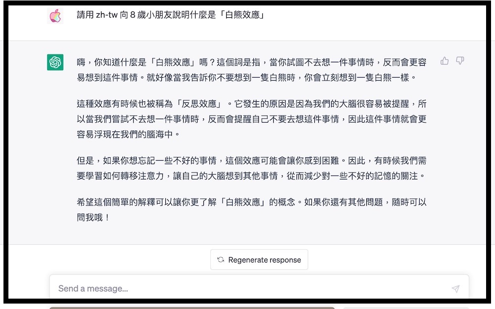 「8 歲」就是讓 ChatGPT 語意呈現的白話程度。這裡不只能夠用「8 歲」,也能用「小學生」、「初學者」、「白話淺顯」等方式來替換,得到不同的說話方式呈現。