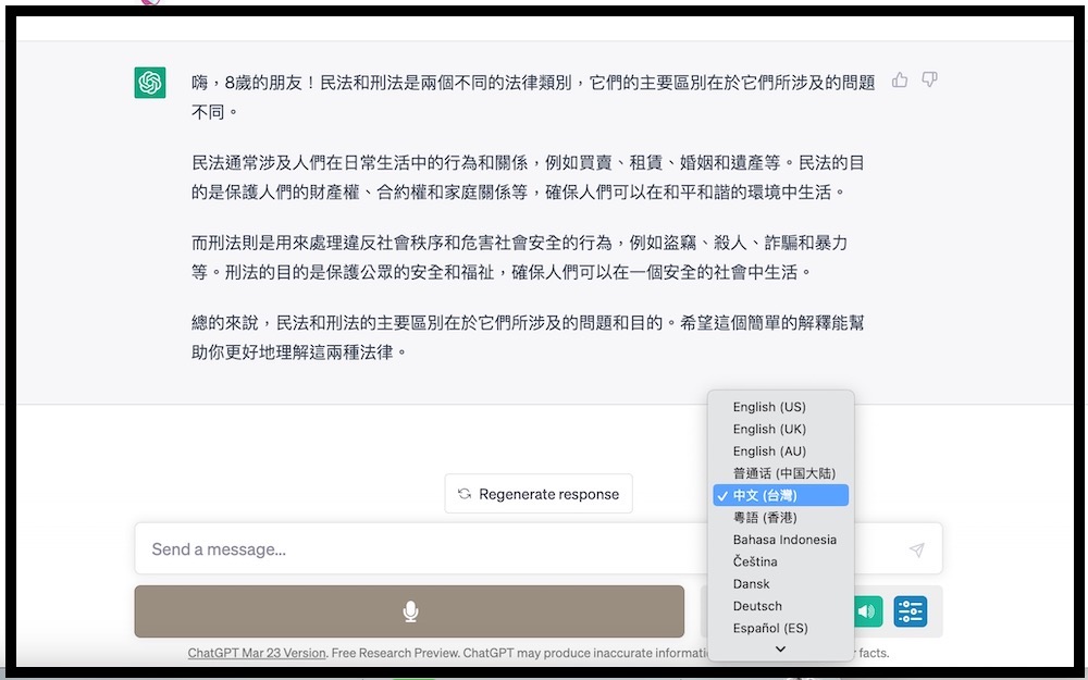 因爲 ChatGPT 預設是僅以文字的方式呈現,中文世界剛巧有「簡體中文」與「繁體中文」兩種文字方式,普遍來說「正體中文」指的就是繁體中文,當然我們也可以輸入繁體中文以及 ZH-TW 來得到一樣的顯示方式。