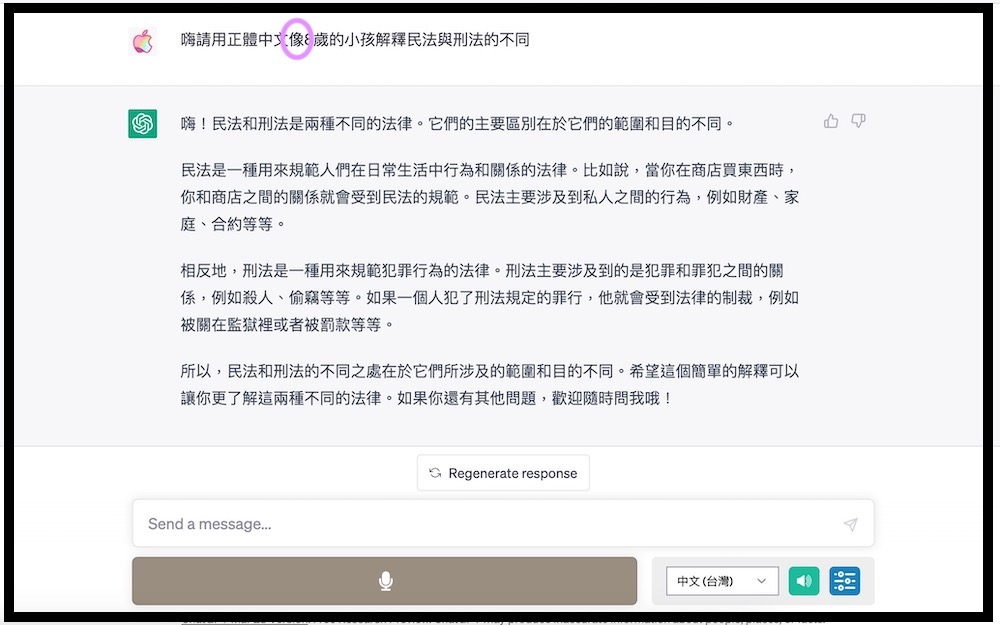 如果說出的內容發現有錯字,也不要緊。像例子中的「向 8 歲小孩」,語音輸入後變成「像 8 歲小孩」,但對 ChatGPT 而言似乎並不影響對問題的理解與回應的方式。