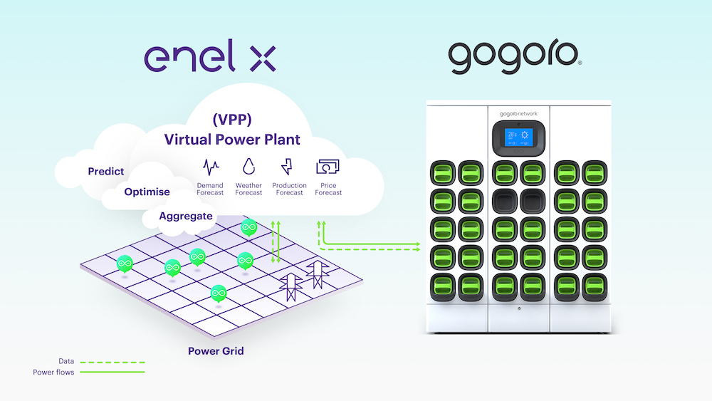 Gogoro與 Enel X 的虛擬電廠於 2022 年展開前導測試計畫,驗證了當電網失衡時,Gogoro Network 電池交換站能夠安全降載、或在必要時饋電至電網。一旦電網恢復平衡, Enel X 的虛擬電廠會向 Gogoro Network 發送指令,使其電池交換站恢復一般用電。Gogoro Network 電池交換站在完成降載與饋電的同時,仍可讓消費者安心使用既有的電池交換服務,突顯 Gogoro Network 電池交換系統是支持台灣能源轉型的理想電力資源。聚合了 Gogoro Network 電池交換站的 Enel X 虛擬電廠,其功效與電力業者新建電廠以滿足用電需求相當。