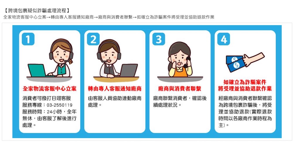 消費者可於週一至週五 9:00-18:00 服務時間撥打 OK 物流客服專線 (03-2631082)立案,由客服了解後協助聯繫廠商,廠商與消費者聯繫確認為跨境包裹詐騙案後,將會受理並協助退款,實際退款時間將以各廠商作業時程為主。