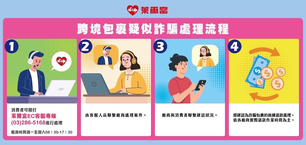 消費者可在週一至週六 08:30-17:30 服務時間,撥打萊爾富 EC 客服專線(03-286-5168),由客服人員聯繫廠商處理案件,並由廠商與消費者聯繫確認狀況,經確認為詐騙包裹後,將依各廠商實際退款作業為主。