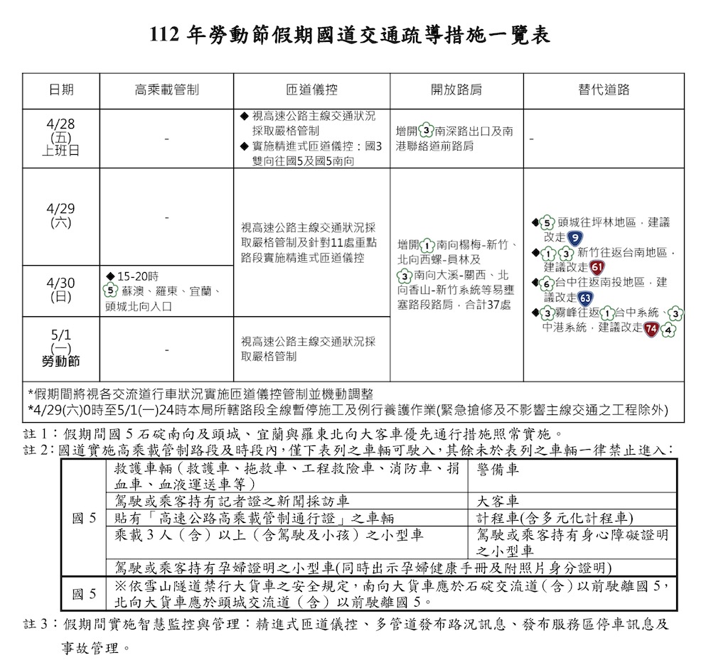 2023 五一連假國道交通懶人包:高乘載管制、匝道封閉、收費措施