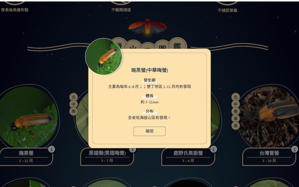 如果還沒有想法要去哪裡賞螢,或是想要對螢火蟲有更多的認識,上方有著「關於螢火蟲」的分類,其中也列出台灣有可能看到的螢火蟲種類,分佈區域與出沒日期。單獨點進去看,還可看見螢火蟲的名字、體長等進一步資訊,以及觀賞螢火蟲時需要注意的事項,即便沒有要去賞螢,也能藉由這互動地圖對螢火蟲多點了解。