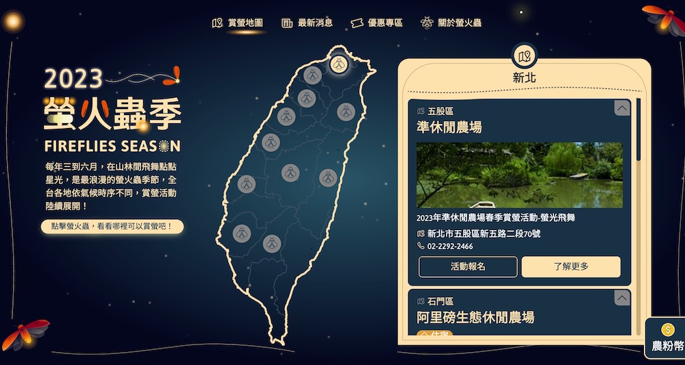 n” target=”_blank” rel=”noopener”>2023 互動賞螢地圖」整合了全台各地賞螢農場、優惠活動與螢火蟲種類等資訊。