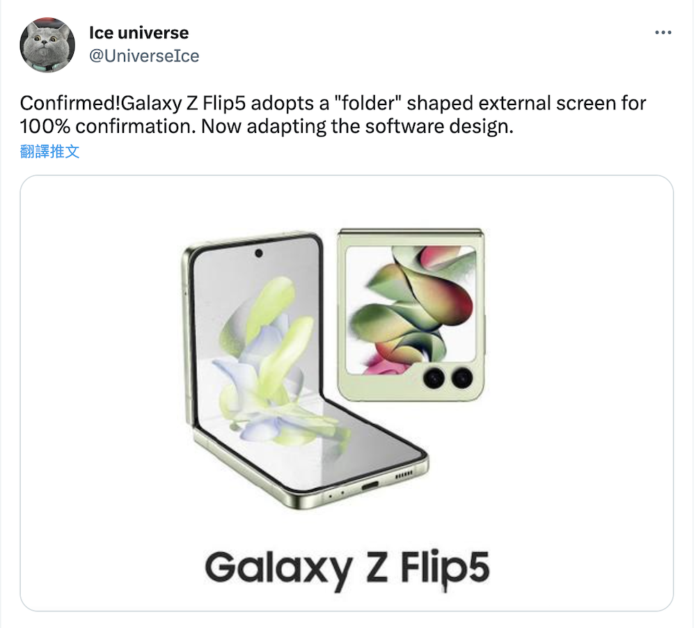 不讓各家小摺疊機專美於前,稍早知名爆料者 Ice Universe 在 twitter 上分享了一張 Samsung Galaxy Z Flip5 的新圖片,並展示了其外觀與謠傳的外部大螢幕設計。