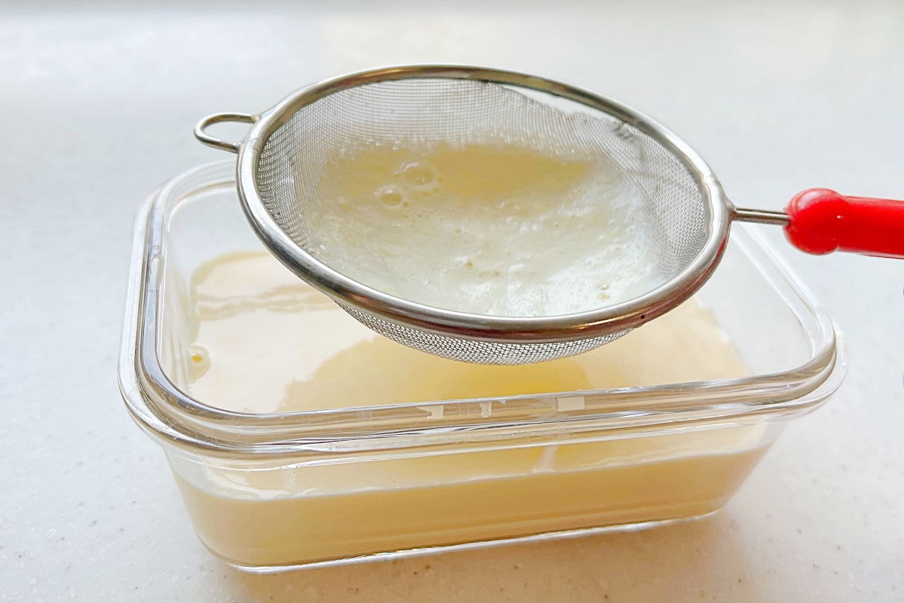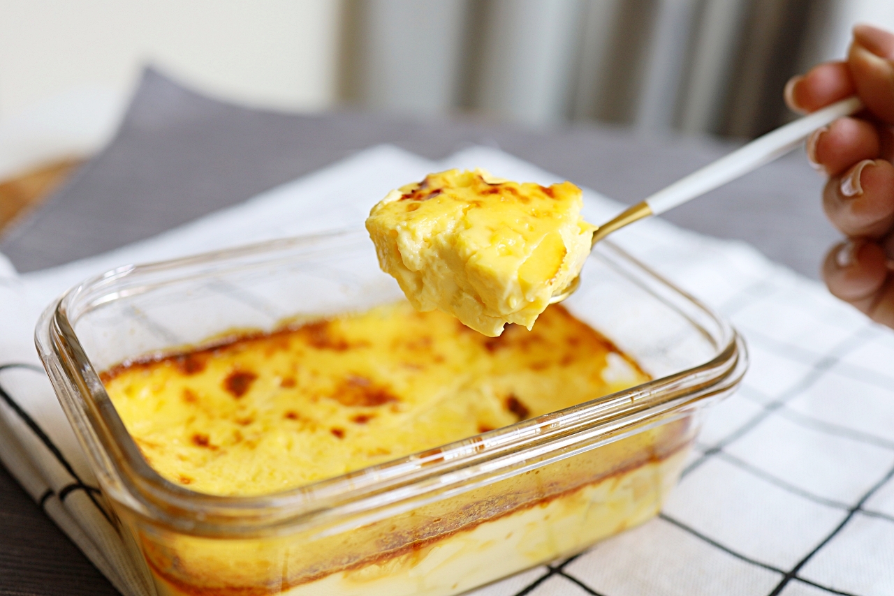 為了讓烤布蕾口感更滑順,建議過篩兩次後再倒入模具,放入烤箱或是氣炸鍋。為了避免表面被烤焦,蓋上一層錫箔紙。