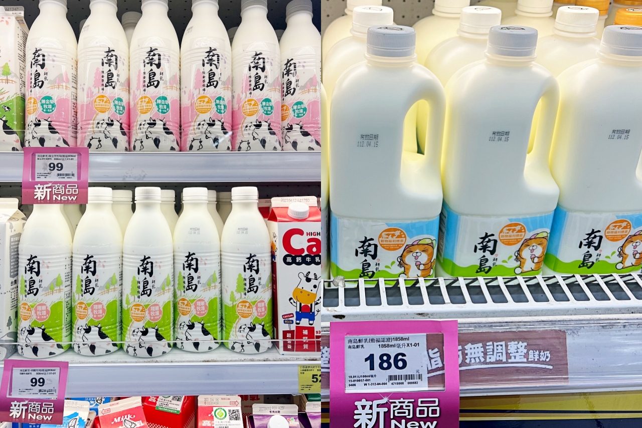 南島鮮乳是來自南台灣牧場,以100%生乳無添加、 無調整、品質香醇為特色。這次新上市的包裝分別是:粉色-陳金榮牧場、綠色-翔順牧場、白爛貓聯名款-陳金榮牧場+翔順牧場。