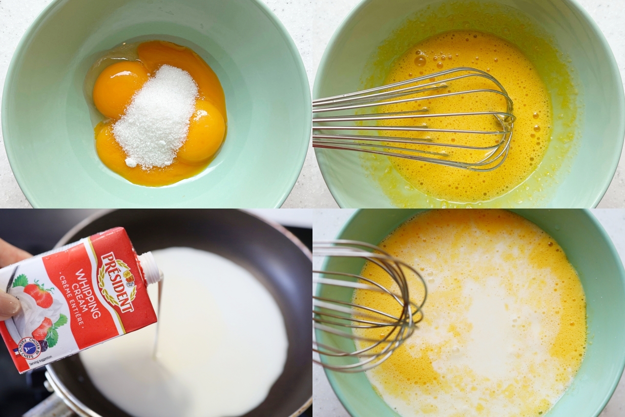 4⃣️ 加熱的鮮奶液放涼後倒入蛋黃液中,攪拌均勻(一定要放涼再倒入蛋黃液,不然會變蛋花湯)