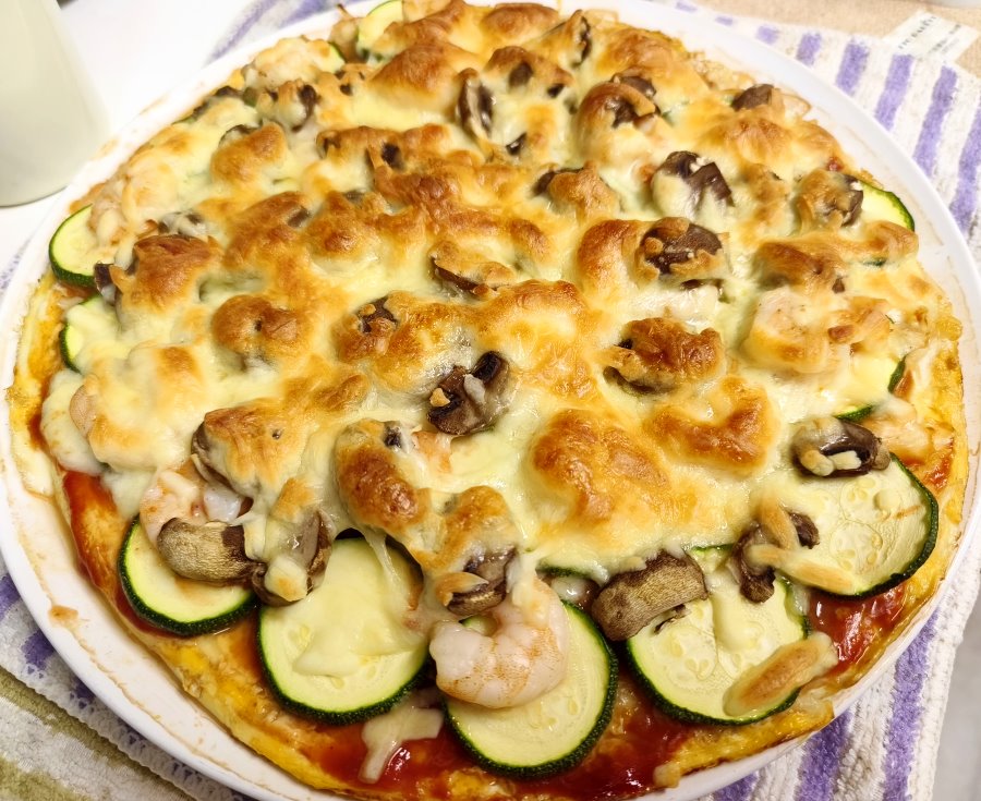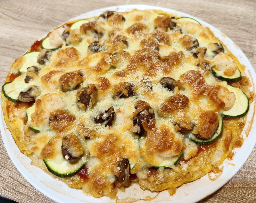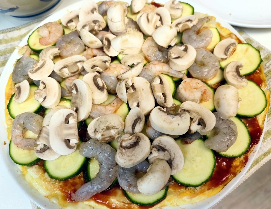 ▼接著就可以放上自己喜歡的配料,我們放的是櫛瓜、蝦仁、蘑菇等等,整個鋪好鋪滿,在家自己做就是霸氣,而且每一口都能吃到配料的感覺好過癮!