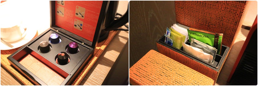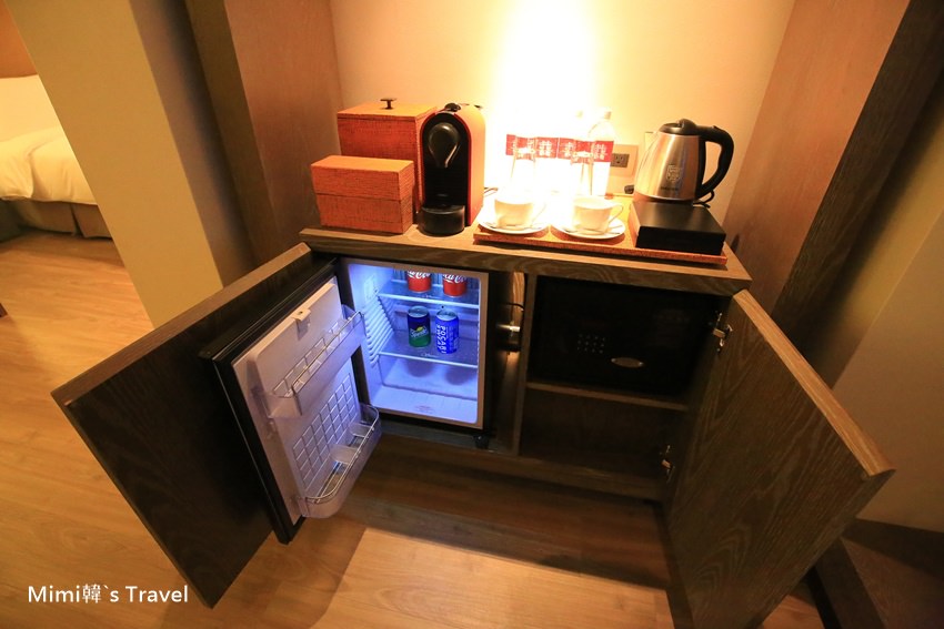 Mini bar 有膠囊咖啡機、熱水壺、冰箱與相關備品,除了有瓶裝水,冰箱裡的飲料也是免費使用。