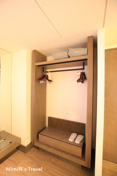房門旁的大衣櫥,準備有衣架、鞋拔鞋刷等工具,另外上面兩個大包包裡面是浴袍。