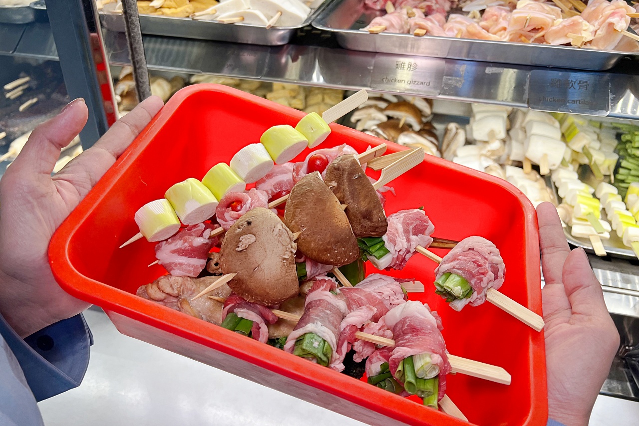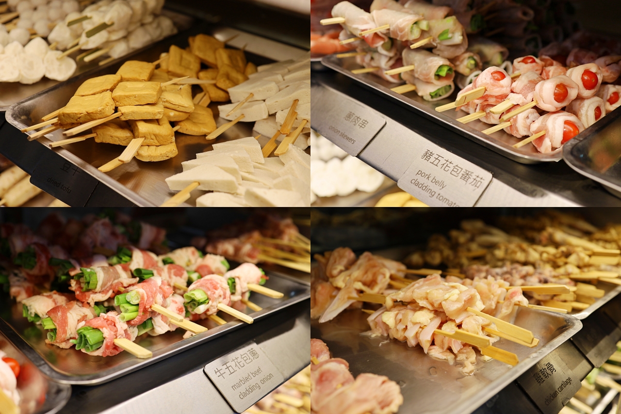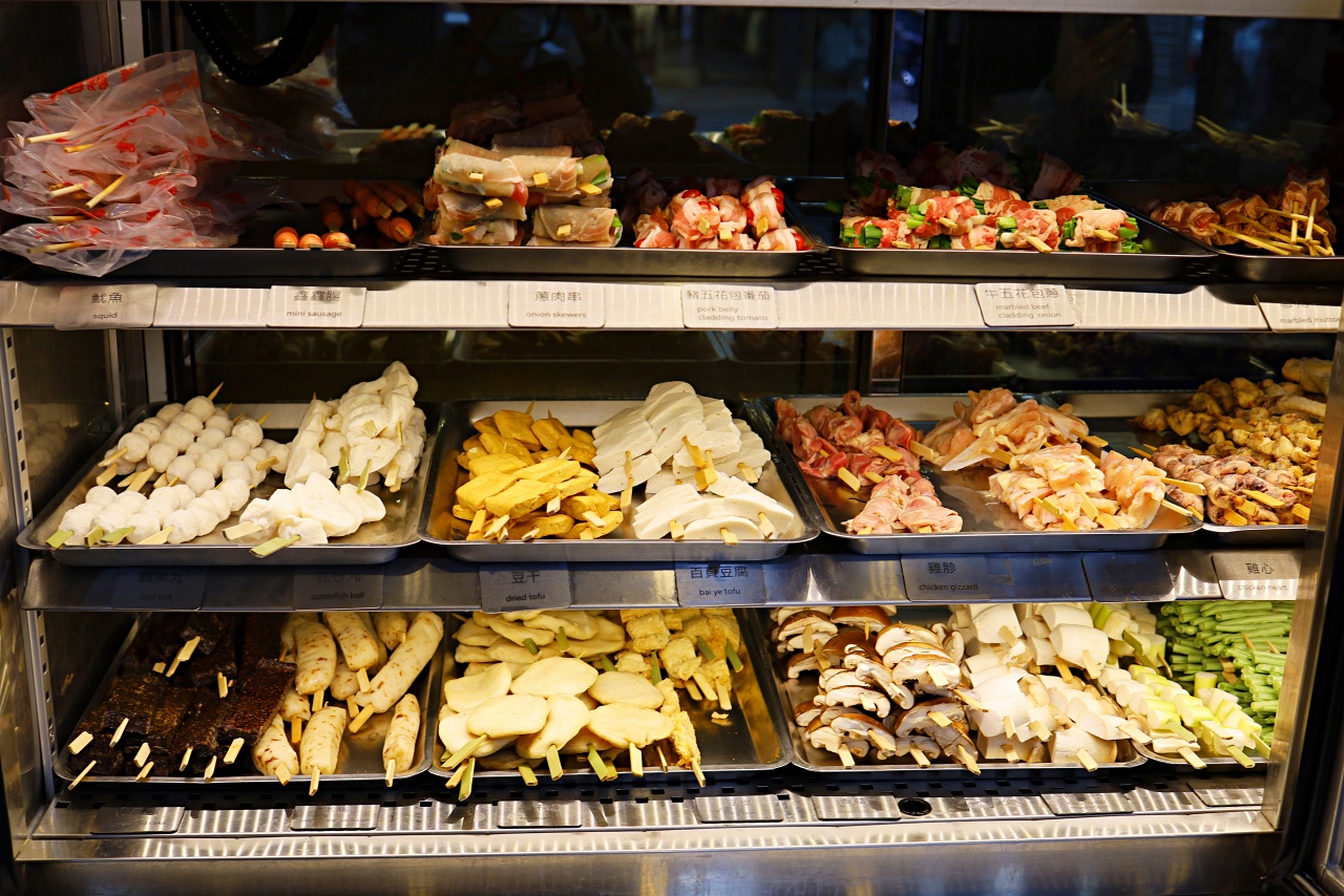 店面小小的,是以外帶、外送為主,如果想要在這裡吃,騎樓有兩張小桌供客人使用。點餐的方式很特別,在擦到沒有一絲灰塵的直立式冷藏櫃裡面,擺了超多食材,光是眼睛看就覺得太開胃了。這裡採用自助式拿取的方式,想吃什麼就拿什麼,本來還想要減肥的我,光看到眼前的上百串食材就忍不住一直拿。