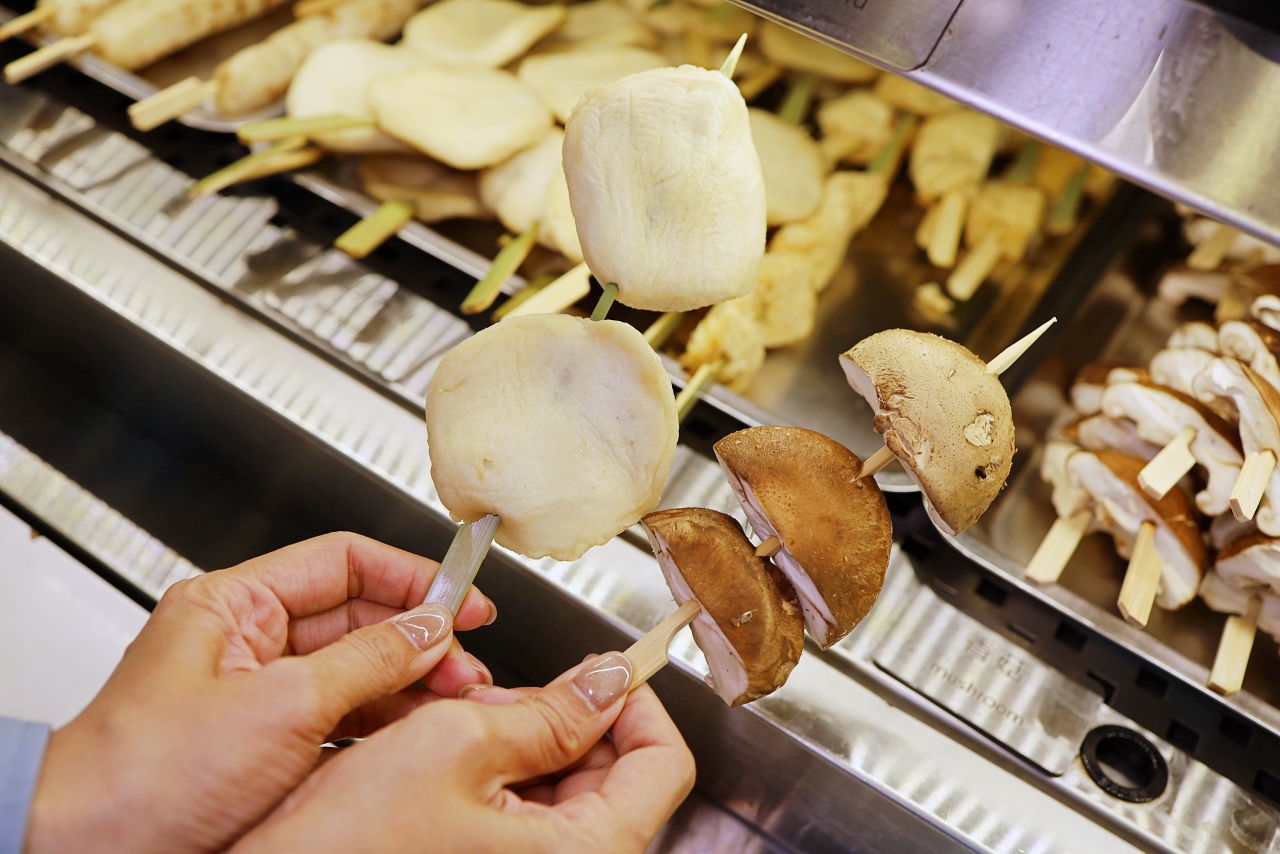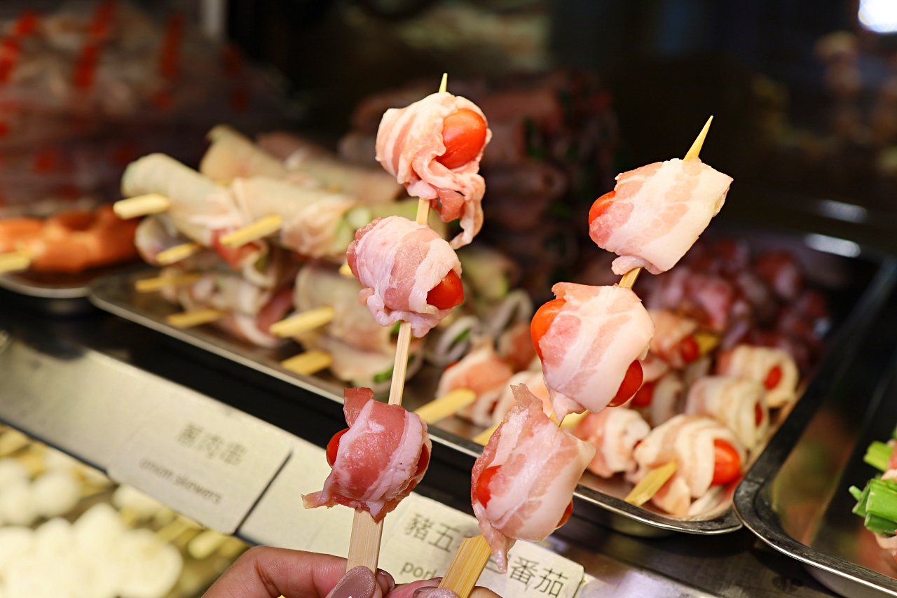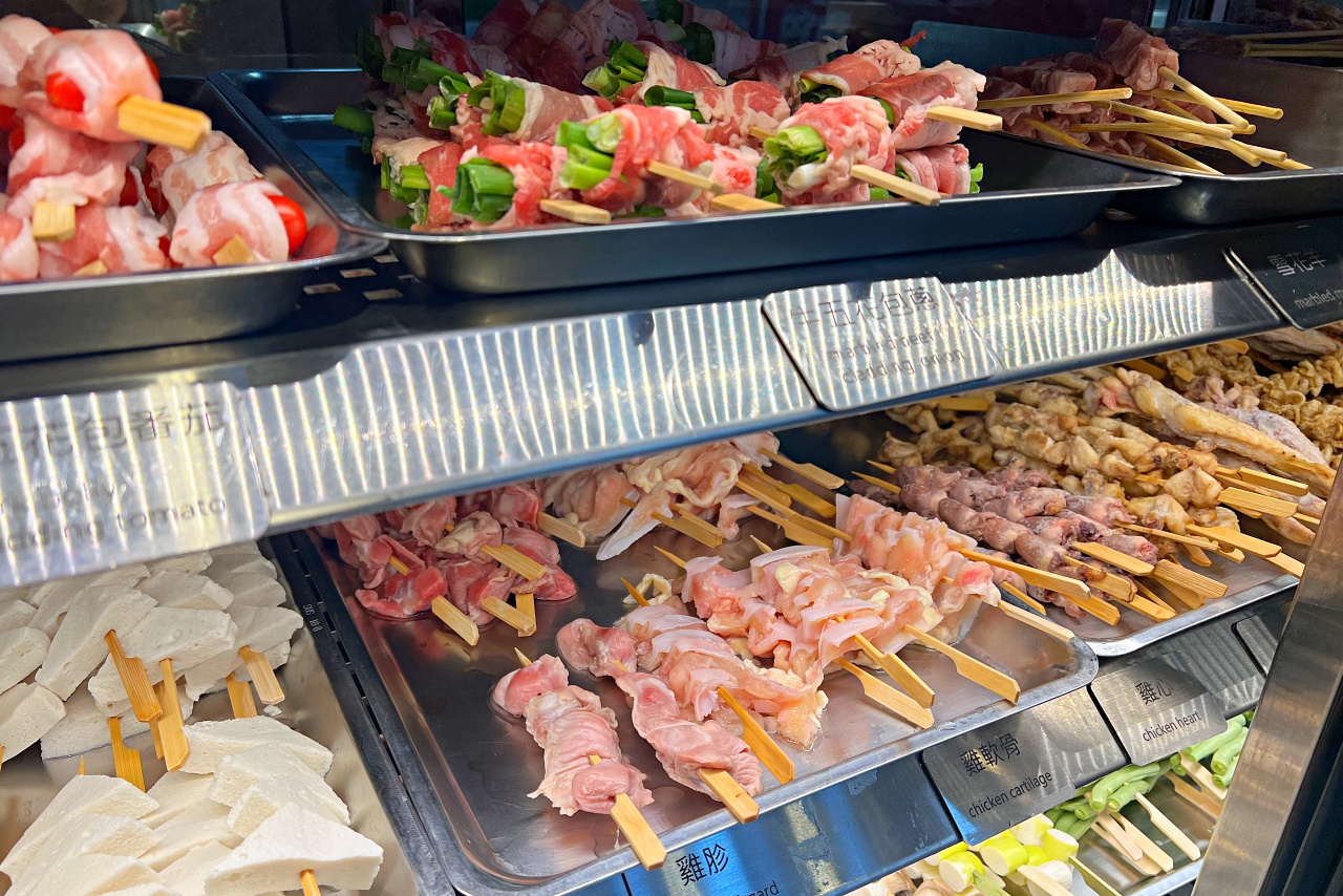店面小小的,是以外帶、外送為主,如果想要在這裡吃,騎樓有兩張小桌供客人使用。點餐的方式很特別,在擦到沒有一絲灰塵的直立式冷藏櫃裡面,擺了超多食材,光是眼睛看就覺得太開胃了。這裡採用自助式拿取的方式,想吃什麼就拿什麼,本來還想要減肥的我,光看到眼前的上百串食材就忍不住一直拿。