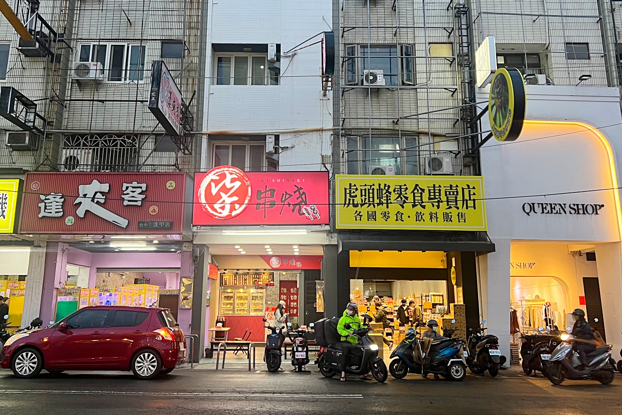 【柒串燒逢甲店】位在逢甲大學旁邊的福星路上,不管是停車還是住附近飯店的旅客散步過來都非常便利。這一整排都是店面,柒串燒點上燈的紅色招牌,在這一整排的店家裡特別顯眼,雖然是第一次來,但一眼就看到它啦。