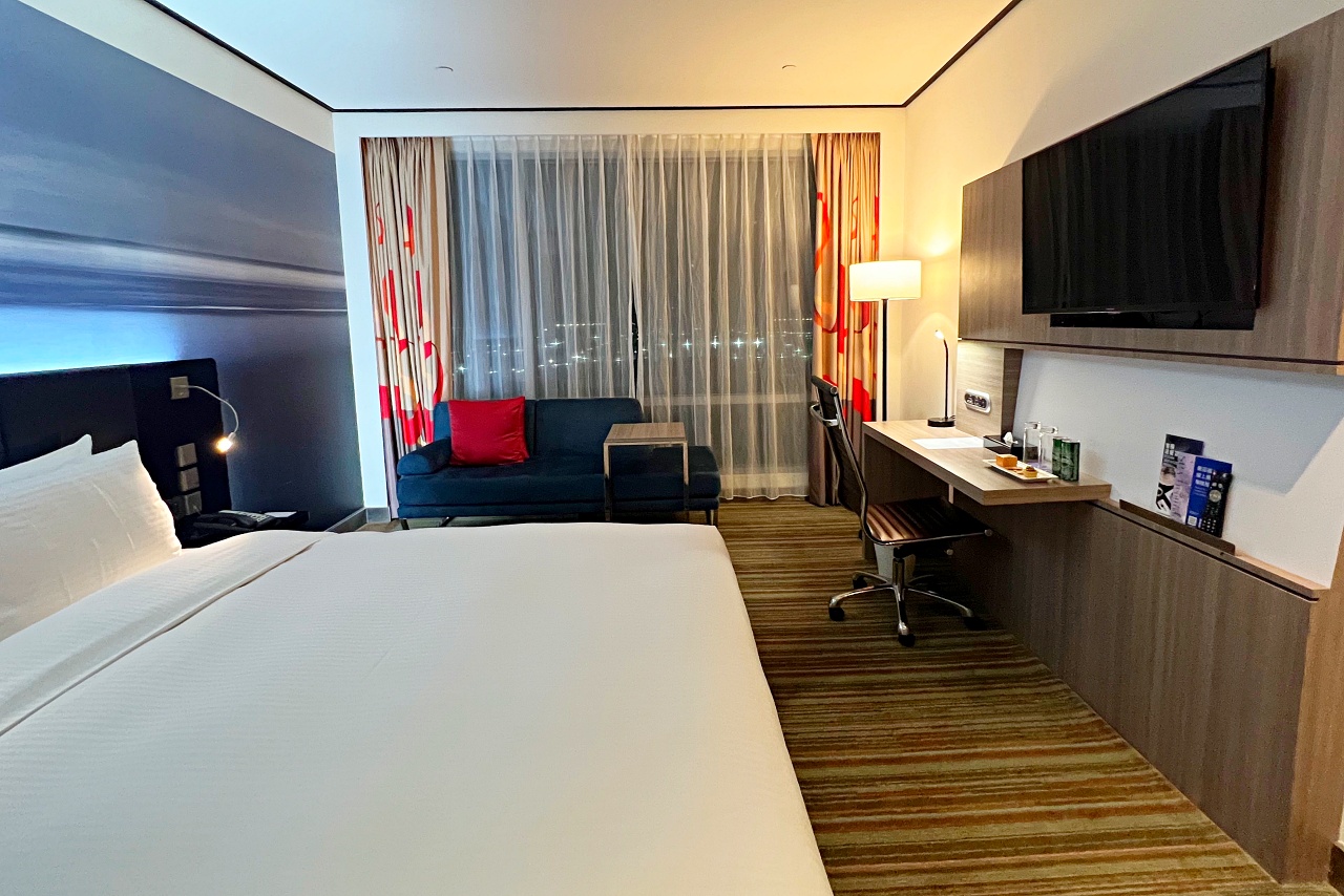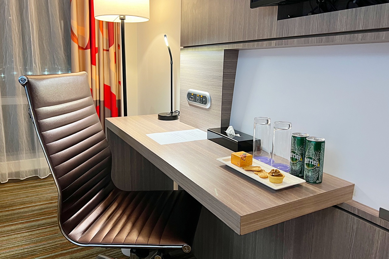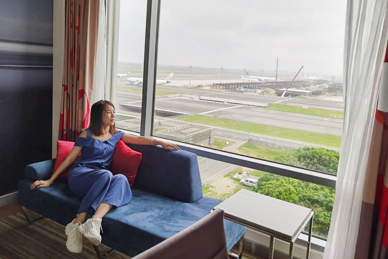 這次入住的景緻客房有獨特的機場景觀,室內空間9坪大,提供乾濕分離衛浴設備、液晶電視、舒適雙人沙發、辦公桌,對於出門在外常常需要臨時工作的我,有這個大書桌很加分。落地窗面對的是機場,雖然鄰近機場但在房間內的隔音很好,幾乎聽不到噪音。