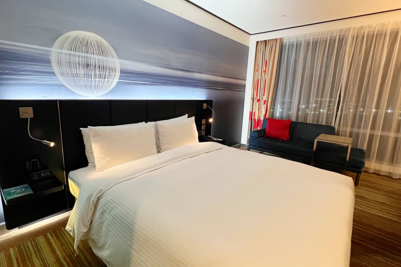 飯店環境舒適,從大門進來就可以看見挑高大廳,舒適時尚的空間設計,入住期間可以盡情享用室內泳池、24小時健身房、SPA芳療館、兒童遊樂區,除此之外飯店內有多樣餐飲,像是中餐廳、西餐廳、咖啡廳、酒吧、烘焙坊、行政酒廊,最特別的是擁有全台獨家的機場景觀。
